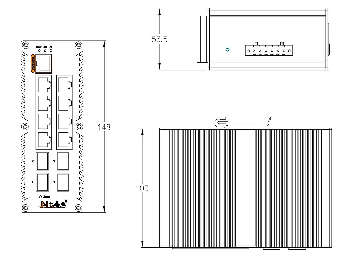 外殼:金屬材質 安裝:DIN 卡軌式,壁掛式安裝 重量:0.85Kg 尺寸:148X103X53.5mm 重量:0.82g |