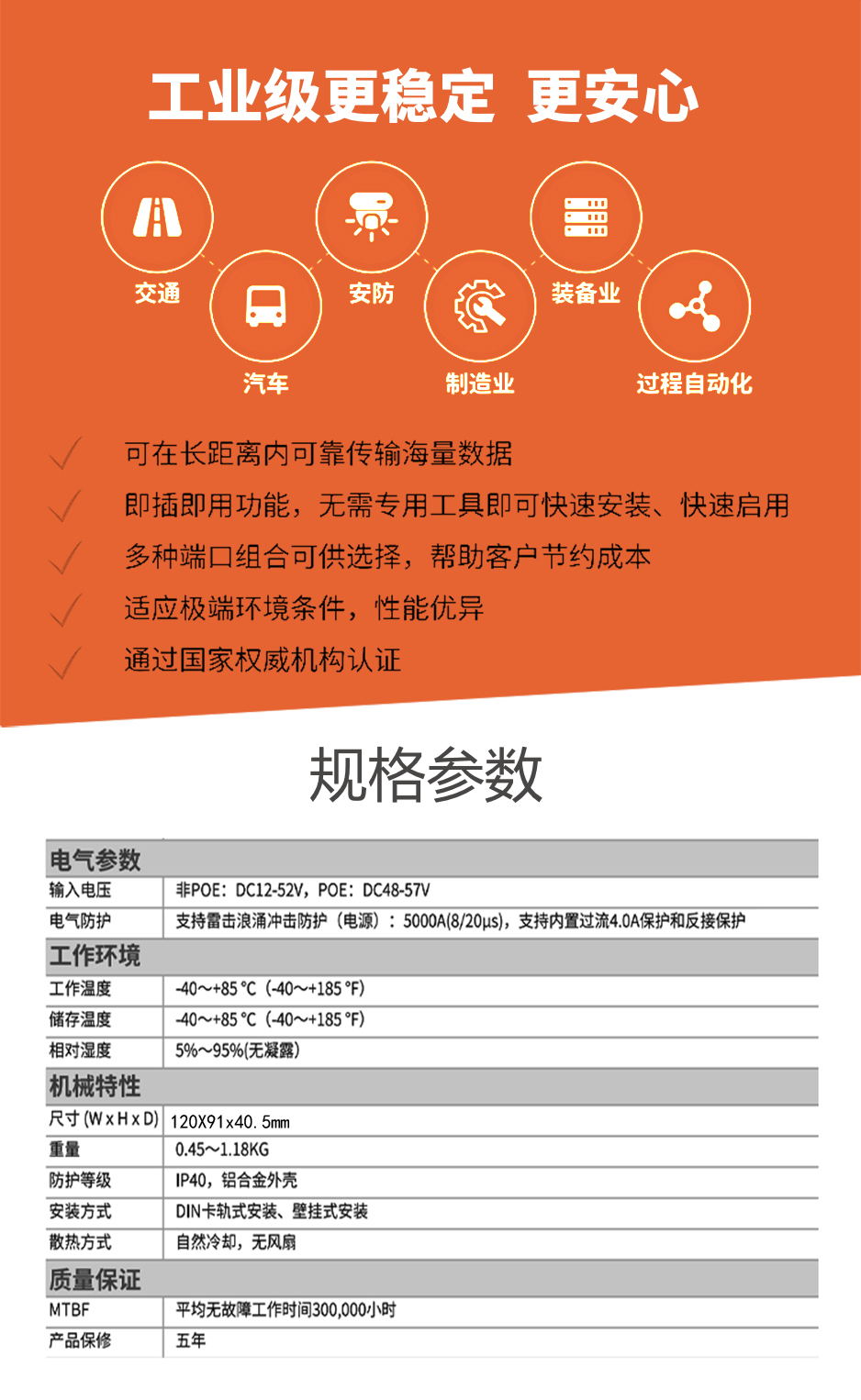 工業(yè)級(NT品牌)非網(wǎng)管1百光2百電,ST/單模單纖20KM(1550nm),導(dǎo)軌式-DC12~52V供電-寬溫(-40℃-85℃)。默認(rèn)不含AC電源適配器。 |
