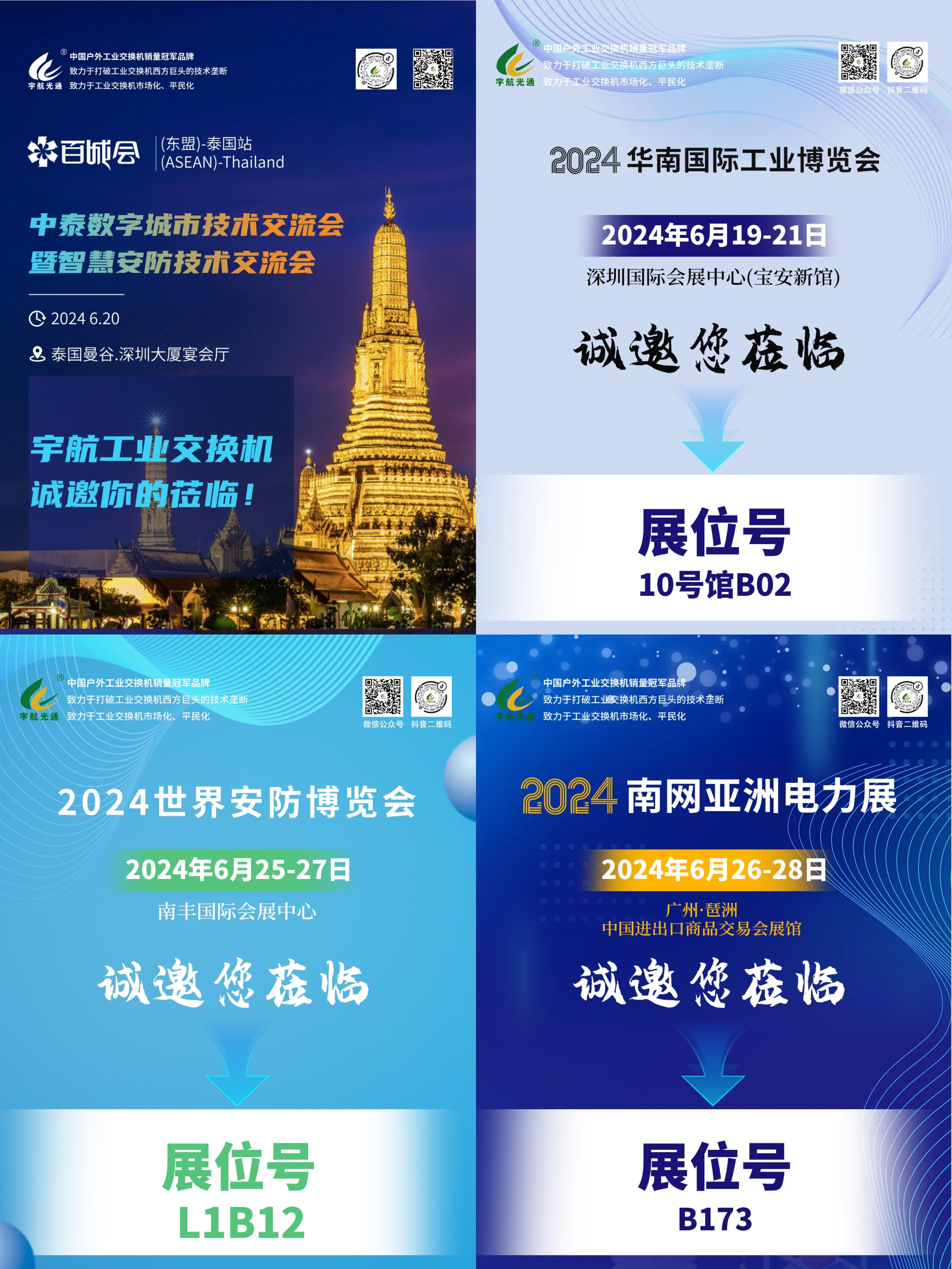 六月下旬,宇航工業(yè)交換機(jī)繼續(xù)與您相約國(guó)內(nèi)外各大城市,深圳,泰國(guó)曼谷,湖南湘潭,湖北宜昌、恩施、廣西來賓、廣州、上海等地!宇航工業(yè)交換機(jī)期待您的蒞臨!