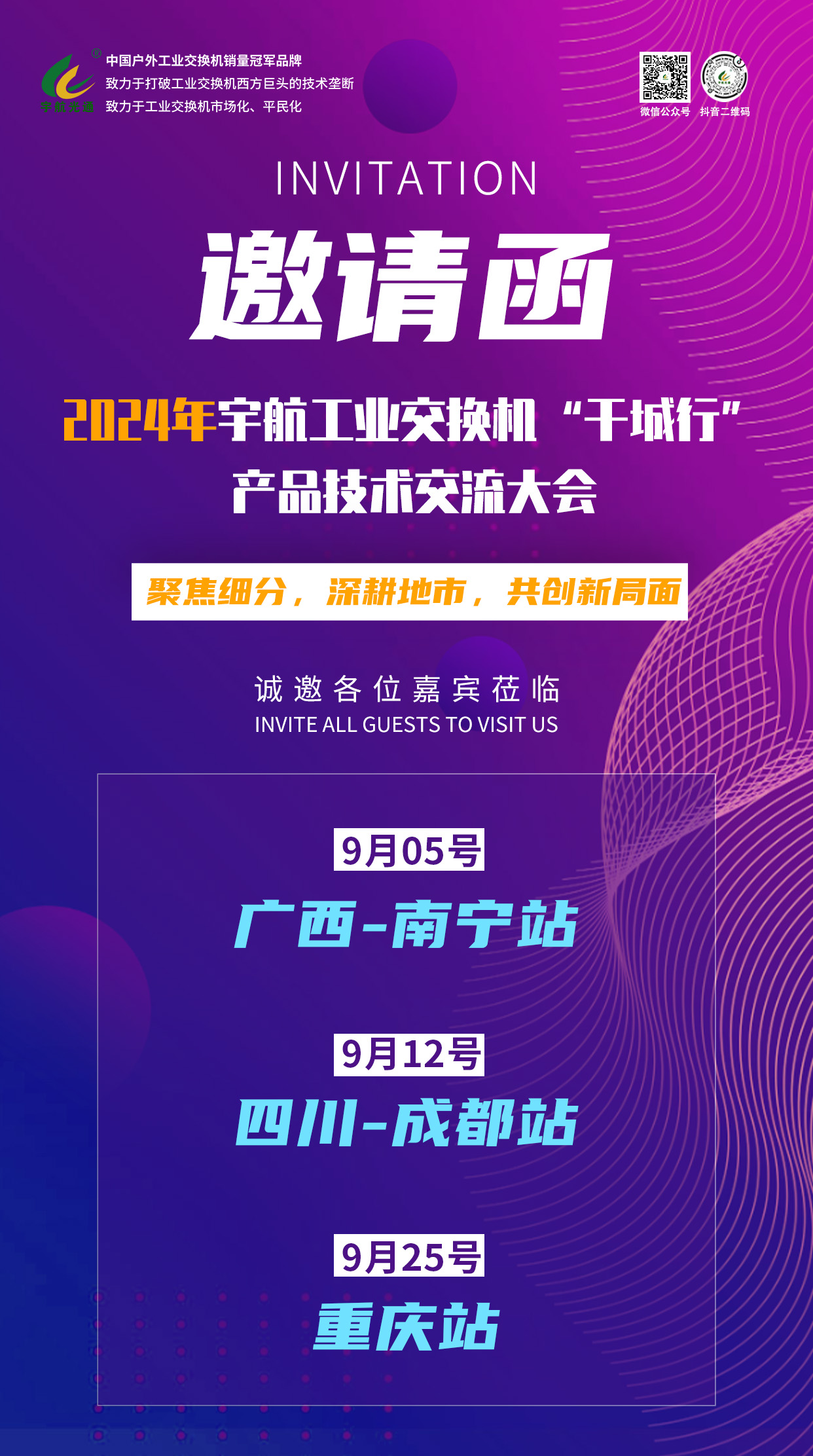 九月,宇航工業交換機將在重慶、深圳、鄭州等城市亮相行業各大展會,同時,為深化技術交流與合作,還將在廣西南寧、四川成都及重慶等地舉辦“2024宇航工業交換機千城行產品技術交流大會”,旨在通過這一系列活動,全面展示宇航工業交換機的卓越性能與創新應用,促進產業上下游的緊密合作,共同推動工業通信技術的革新與發展。屆時,歡迎各位領導嘉賓蒞臨現場,參觀指導!