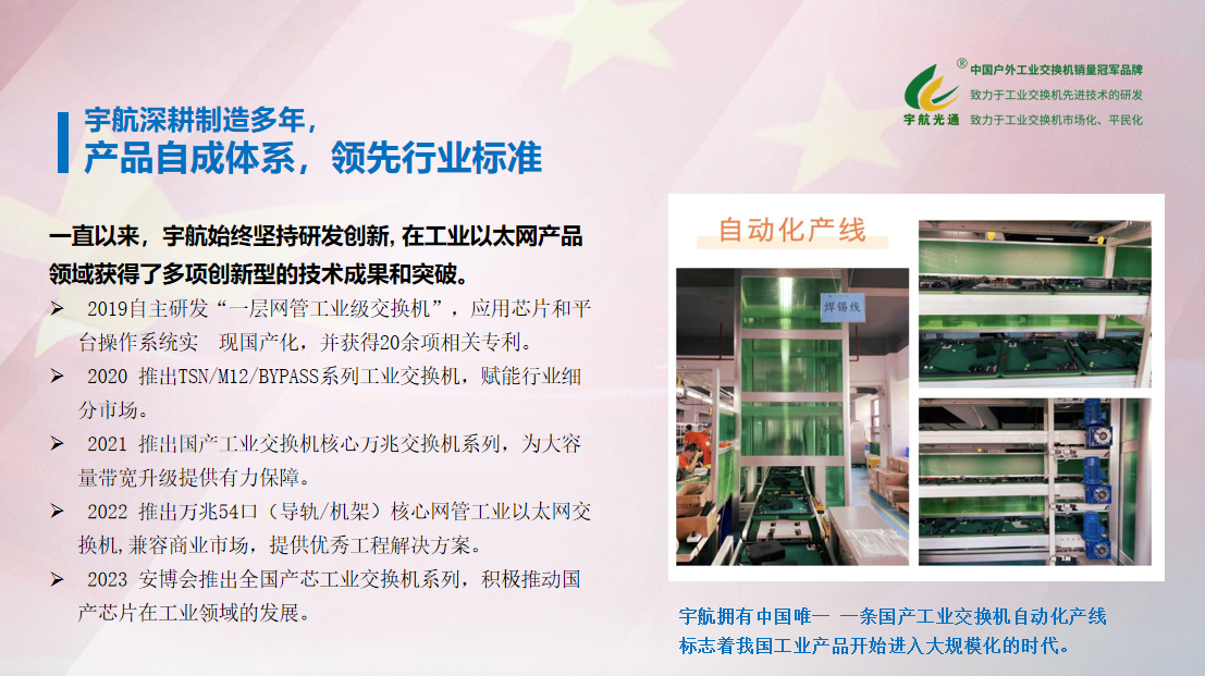 宇航作為一家專注于工業(yè)以太網(wǎng)交換機(jī)研發(fā)、生產(chǎn)、銷售和服務(wù)于一體的國家專精特新小巨人企業(yè)、國家高新技術(shù)企業(yè),我們深知自身的成長與發(fā)展離不開祖國的繁榮與昌盛。多年來,我們始終秉承“創(chuàng)新驅(qū)動,質(zhì)量為本”的理念,為客戶提供高性能、高穩(wěn)定性的工業(yè)交換機(jī)產(chǎn)品,以實際行動為祖國的建設(shè)貢獻(xiàn)力量。工業(yè)交換機(jī)作為現(xiàn)代工業(yè)通信的重要組成部分,承擔(dān)著數(shù)據(jù)傳輸、信息交換等關(guān)鍵任務(wù),也在智能制造、智慧城市、新能源等領(lǐng)域發(fā)揮著舉足輕重的作用。宇航始終緊跟時代步伐,不斷創(chuàng)新技術(shù),提升產(chǎn)品品質(zhì),以滿足日益增長的市場需求。