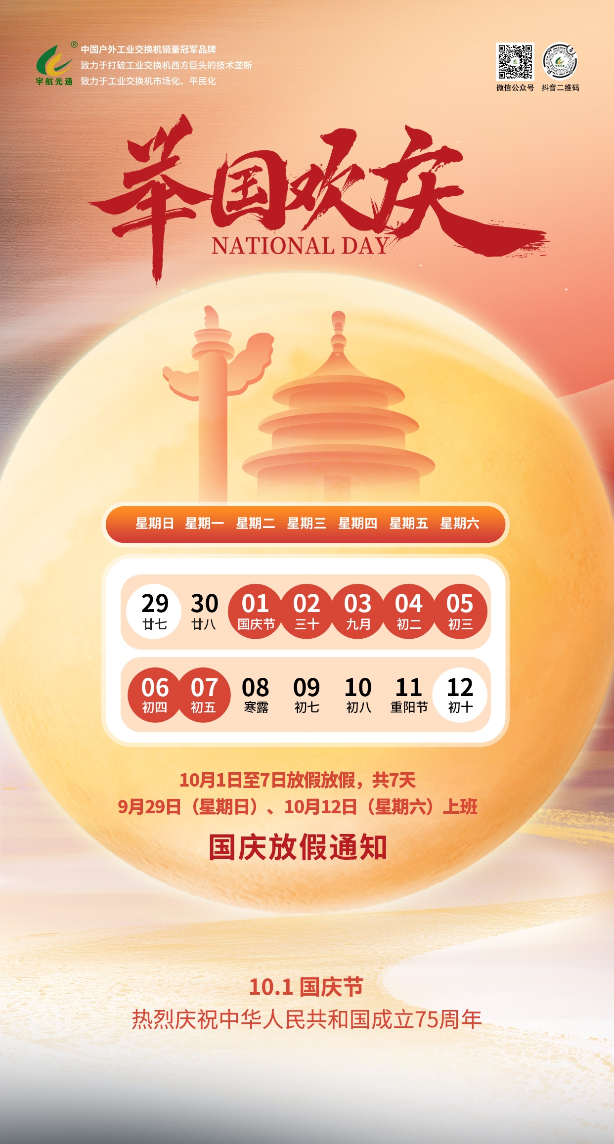 習(xí)主席言:“愛國主義,是我們民族精神的核心,是中華民族團(tuán)結(jié)奮斗、自強(qiáng)不息的精神紐帶”。在這個金秋送爽、普天同慶的時刻,我們迎來了祖國母親的75歲華誕,宇航工業(yè)交換機(jī)同事祝福偉大的祖國生日快樂,繁花似錦!同時,也向大家致以最誠摯的節(jié)日祝福!