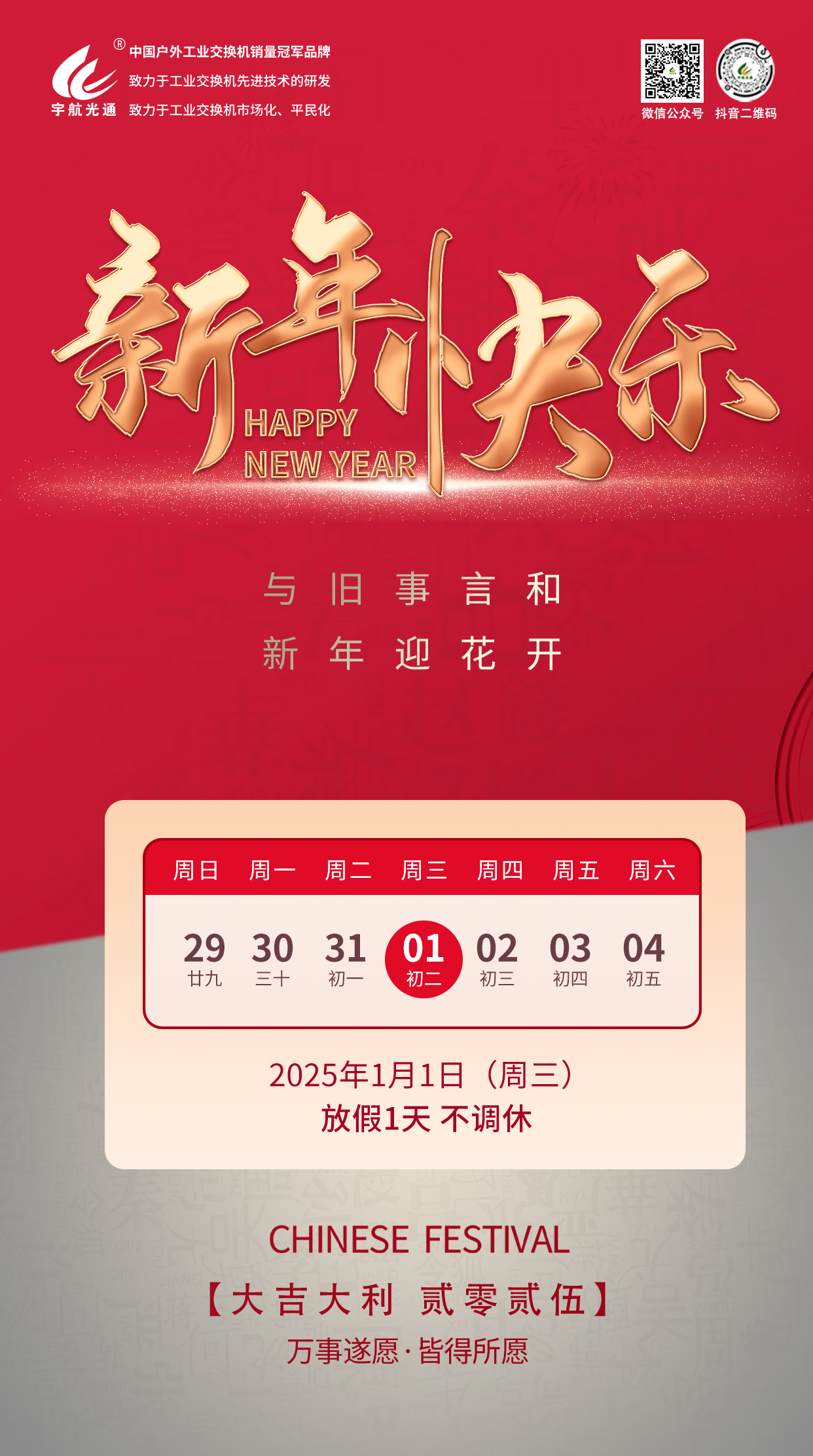 歲序更替,華章日新。闊別了充實(shí)而不尋常的2024年,我們迎來了充滿希望的2025年,值此新的一年到來之際,宇航工業(yè)交換機(jī)全體同事向社會(huì)各界領(lǐng)導(dǎo)、朋友們以及一直以來關(guān)心和支持我們的合作伙伴、供應(yīng)商表示最衷心的感謝!向辛勤付出的每一位同事致以最誠摯的敬意!