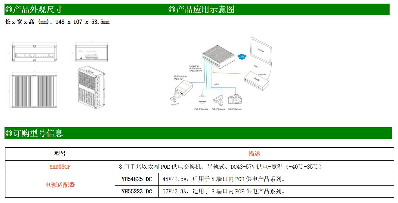 8路千兆電口工業級以太網交換機,支持8個10Base-T/100Base-TX POE電口。產品符合FCC、CE、ROHS標準。YH300-08FP交換機具有-40℃~85℃的工作溫度,具有超強的堅固度能適應各種嚴苛環境,也可以非常方便的安置在空間緊湊的控制箱中。導軌的安裝特性、寬溫操作及擁有IP40防護等級的外殼及LED指示燈,使YH300-08FP成為一個即插即用的工業級設備,為用戶的以太網設備聯網提供可靠、便捷的解決方案。