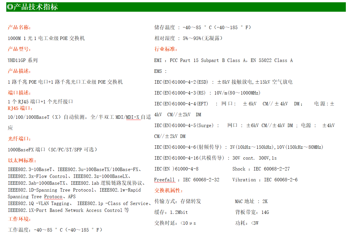 1路千兆POE電口+1路千兆FX光口工業(yè)級以太網(wǎng)POE交換機,支持1個10/100Base-TX電口和1個100Base-X光口。產(chǎn)品符合FCC、CE、ROHS標(biāo)準(zhǔn)。YH300-11GP系列交換機具有-40℃~85℃的工作溫度,具有超強的堅固度能適應(yīng)各種嚴(yán)苛環(huán)境,也可以非常方便的安置在空間緊湊的控制箱中。導(dǎo)軌的安裝特性、寬溫操作及擁有IP40防護(hù)等級的外殼及LED指示燈,使YH300-11GP成為一個即插即用的工業(yè)級設(shè)備,為用戶的以太網(wǎng)設(shè)備聯(lián)網(wǎng)提供可靠、便捷的解決方案。