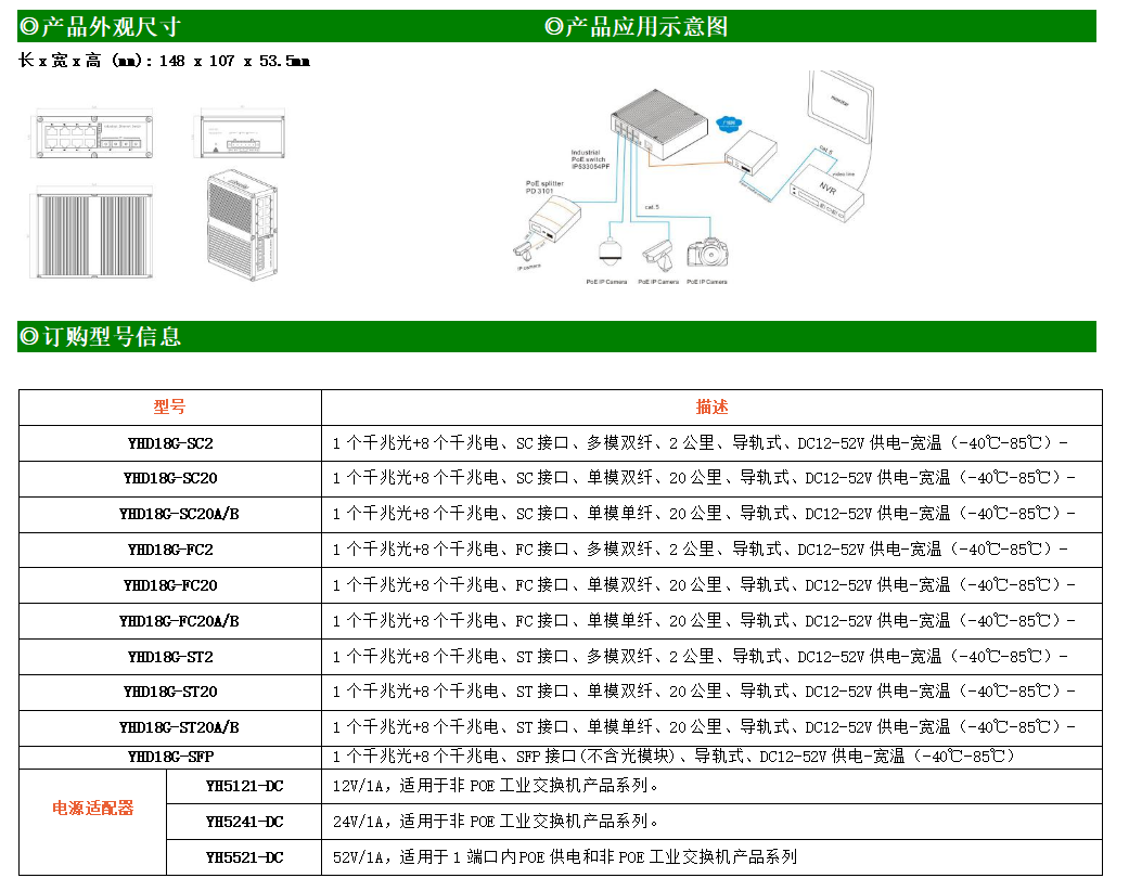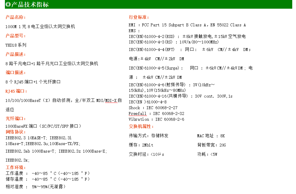 8路千兆電口+1路千兆FX光口工業(yè)級(jí)以太網(wǎng)交換機(jī),支持8個(gè)100Base-T/1000Base-TX電口和1個(gè)1000Base-X光口。產(chǎn)品符合FCC、CE、ROHS標(biāo)準(zhǔn)。YH300-18G系列交換機(jī)具有-40℃~85℃的工作溫度,具有超強(qiáng)的堅(jiān)固度能適應(yīng)各種嚴(yán)苛環(huán)境,也可以非常方便的安置在空間緊湊的控制箱中。導(dǎo)軌的安裝特性、寬溫操作及擁有IP40防護(hù)等級(jí)的外殼及LED指示燈,使YH300-18G系列成為一個(gè)即插即用的工業(yè)級(jí)設(shè)備,為用戶的以太網(wǎng)設(shè)備聯(lián)網(wǎng)提供可靠、便捷的解決方案。