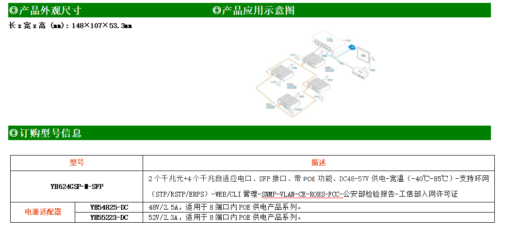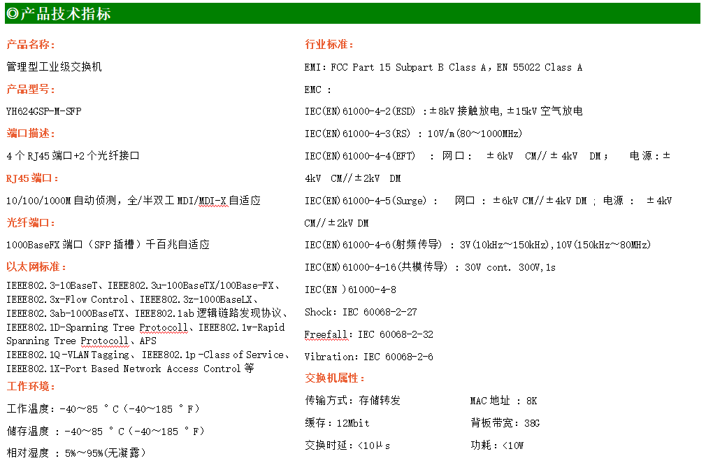 YH600-24GSP-M-SFP是網(wǎng)管型工業(yè)以太網(wǎng)POE交換機(jī),產(chǎn)品符合FCC、CE、RoHS標(biāo)準(zhǔn)。支持2個(gè)千兆光口和4個(gè)千兆電口;支持工業(yè)現(xiàn)場所需的以太網(wǎng)二層協(xié)議,保證通信網(wǎng)絡(luò)的穩(wěn)定性;該系列交換機(jī)采用低功耗、無風(fēng)扇設(shè)計(jì),確保無噪聲干擾,同時(shí)支持-40~85℃工作溫度和良好的EMC電磁兼容性能,保證在惡劣的工業(yè)環(huán)境中保持穩(wěn)定的工作,為工廠自動(dòng)化,智能交通,視頻監(jiān)控等工業(yè)應(yīng)用領(lǐng)域組建快速穩(wěn)定的網(wǎng)絡(luò)終端接入網(wǎng)絡(luò)提供安全可靠的解決方案。