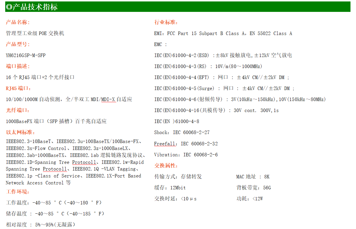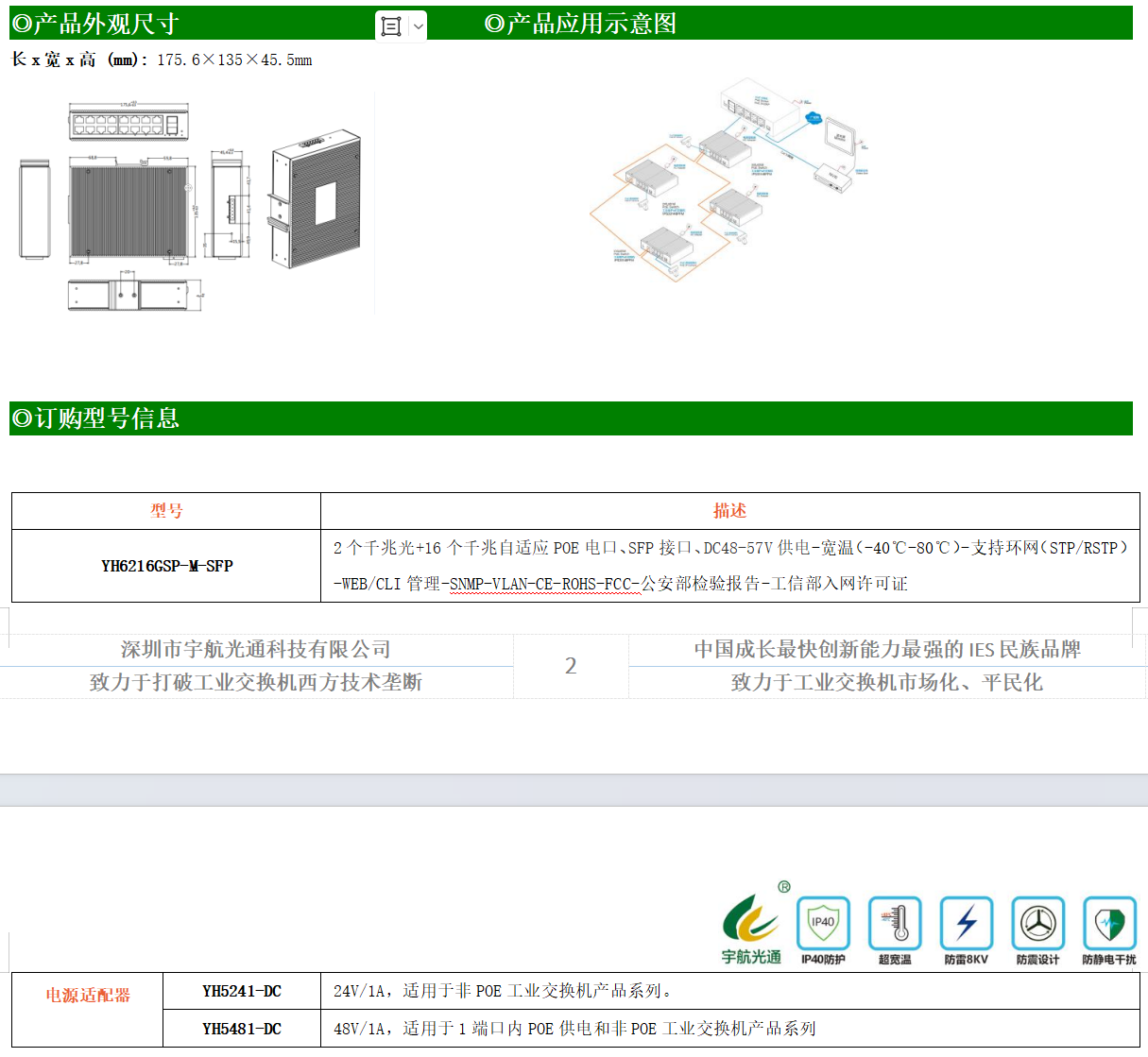 YH600-216GSP-M是網管型工業(yè)以太網POE交換機,產品符合FCC、CE、RoHS標準。支持2個千兆光口和16個千兆POE電口;支持工業(yè)現(xiàn)場所需的以太網二層協(xié)議,保證通信網絡的穩(wěn)定性;該系列交換機采用低功耗、無風扇設計,確保無噪聲干擾,同時支持-40~85℃工作溫度和良好的EMC電磁兼容性能,保證在惡劣的工業(yè)環(huán)境中保持穩(wěn)定的工作,為工廠自動化,智能交通,視頻監(jiān)控等工業(yè)應用領域組建快速穩(wěn)定的網絡終端接入網絡提供安全可靠的解決方案。