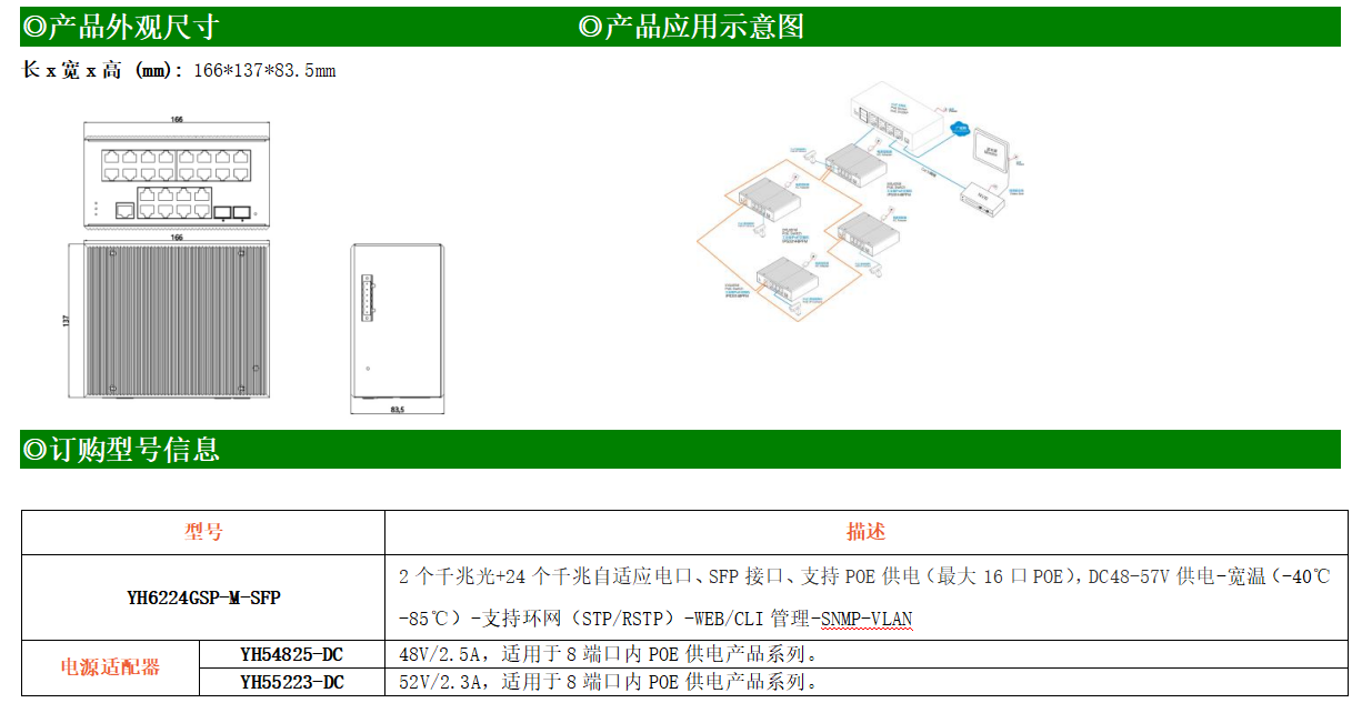 YH600-224GSP-M-SFP是網管型工業以太網交換機,產品符合FCC、CE、RoHS標準。支持2個千兆光口和24個千兆電口(最大16口POE);支持工業現場所需的以太網二層協議,保證通信網絡的穩定性;該系列交換機采用低功耗、無風扇設計,確保無噪聲干擾,同時支持-40~85℃工作溫度和良好的EMC電磁兼容性能,保證在惡劣的工業環境中保持穩定的工作,為工廠自動化,智能交通,視頻監控等工業應用領域組建快速穩定的網絡終端接入網絡提供安全可靠的解決方案。