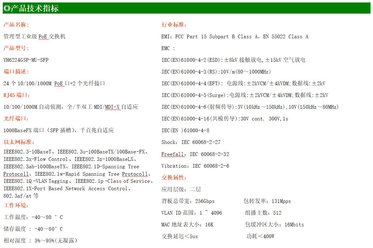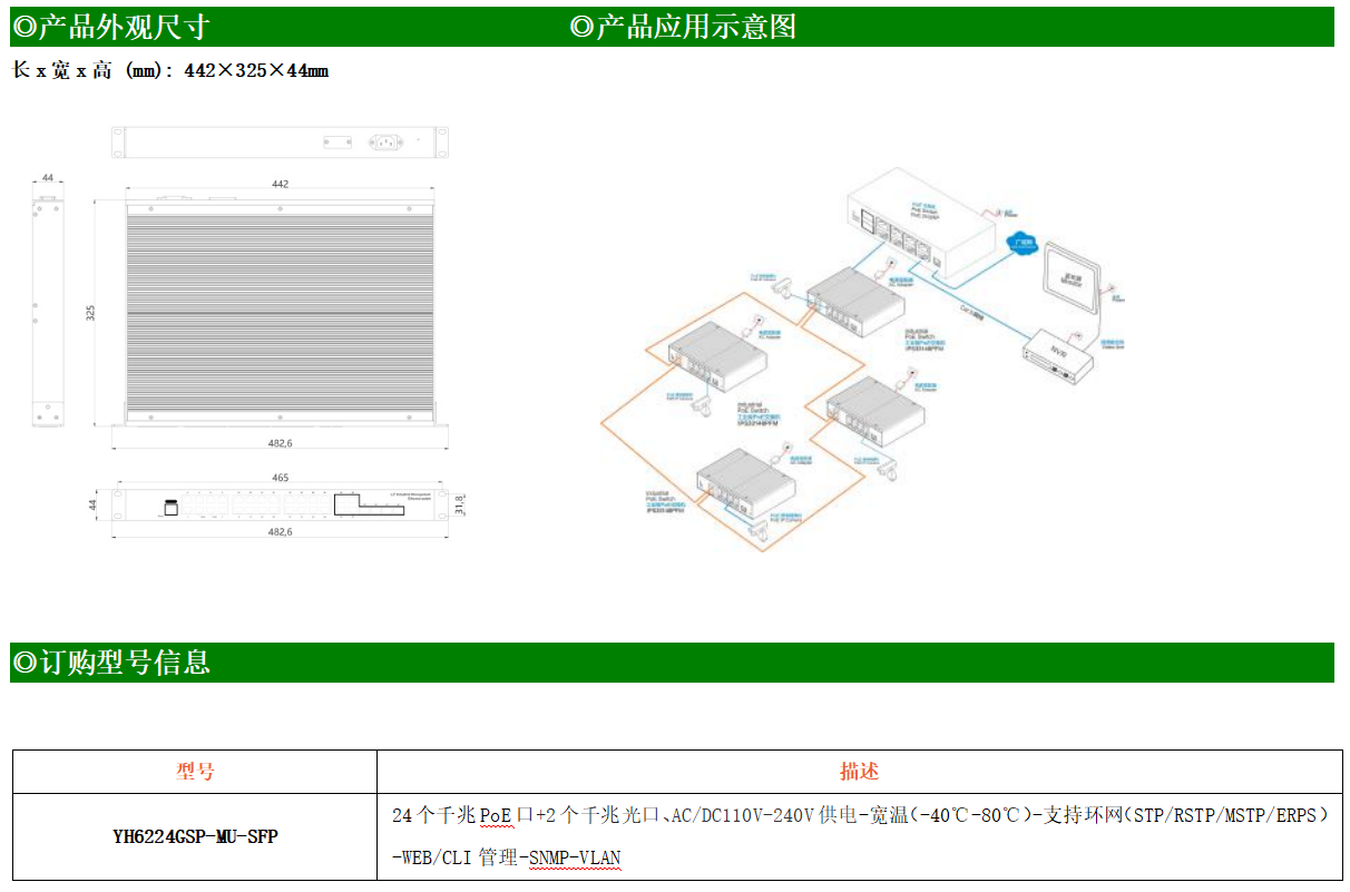 YH600-224GSP-MU-SFP是網管型工業以太網PoE交換機,產品符合FCC、CE、RoHS標準。可提供24個千兆PoE端口,所有PoE端口符合IEEE802.3af/at標準。支持工業現場所需的以太網二層協議,保證通信網絡的穩定性;該系列交換機采用低功耗、無風扇設計,確保無噪聲干擾,同時支持-40~80℃工作溫度和良好的EMC電磁兼容性能,保證在惡劣的工業環境中保持穩定的工作,為工廠自動化,智能交通,視頻監控等工業應用領域組建快速穩定的網絡終端接入網絡提供安全可靠的解決方案。