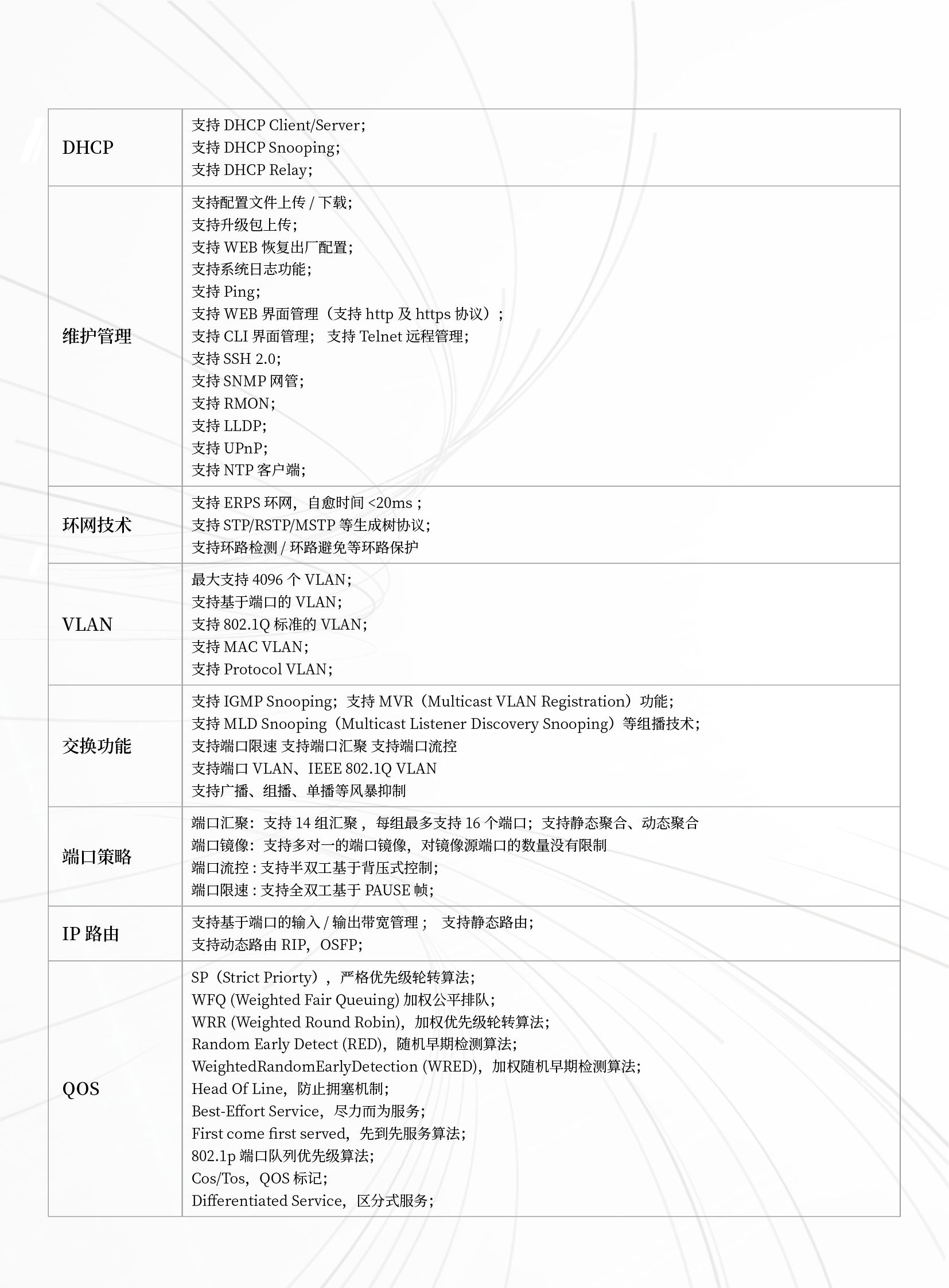 具有L2/L3/L4線速交換能力、具備QoS、帶寬控制、組播等高級功能,是定位于網(wǎng)絡(luò)核心層、實現(xiàn)整體網(wǎng)絡(luò)增值的優(yōu)選設(shè)備。同時,提供基于硬件的流量分類和組播、速率限制和QoS機(jī)制,為用戶開展增值業(yè)務(wù)提供強(qiáng)大的支持。