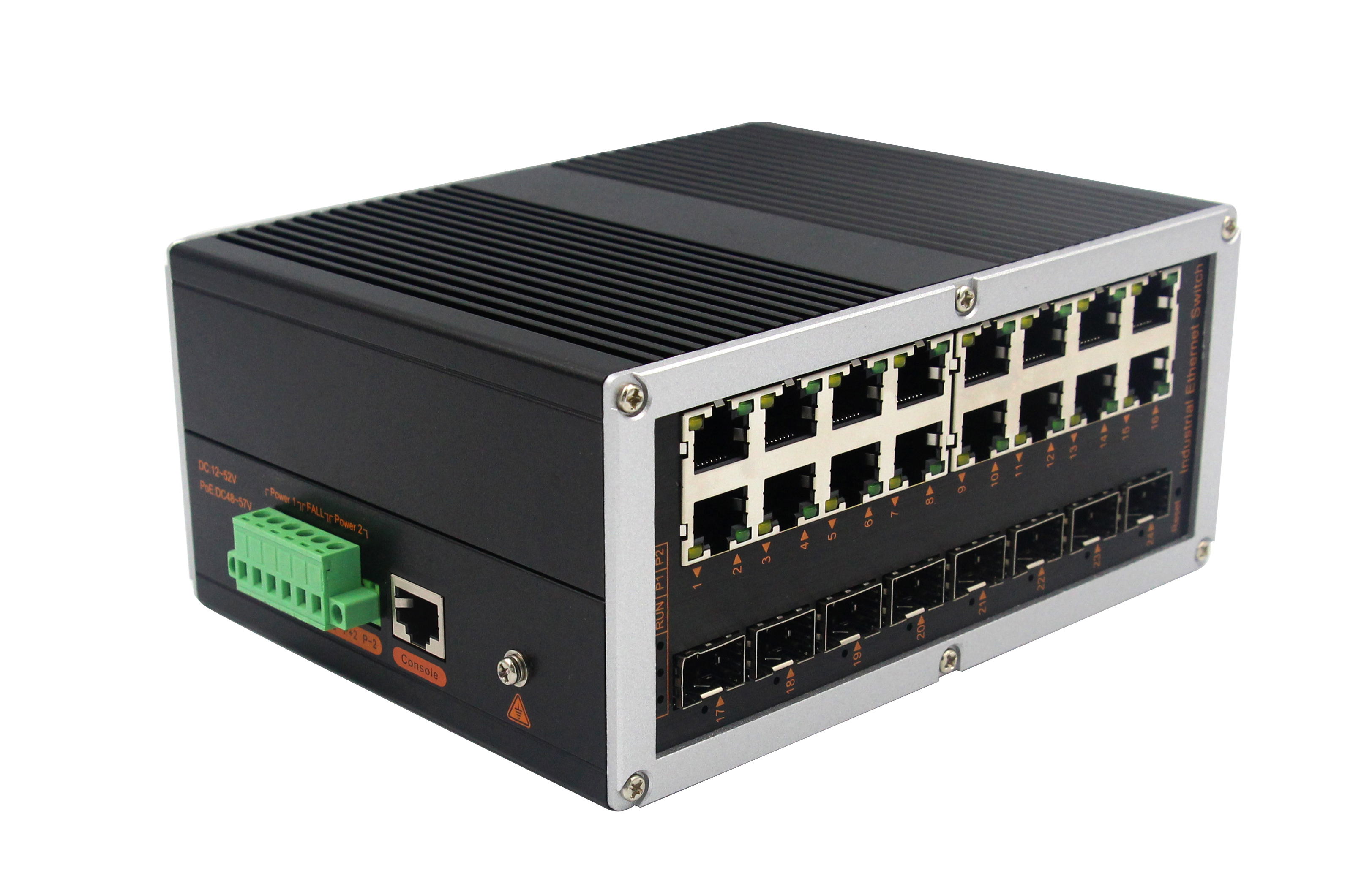 8個千兆光+16個千兆電、SFP接口(不含光模塊)、導(dǎo)軌式、DC12-52V供電 |