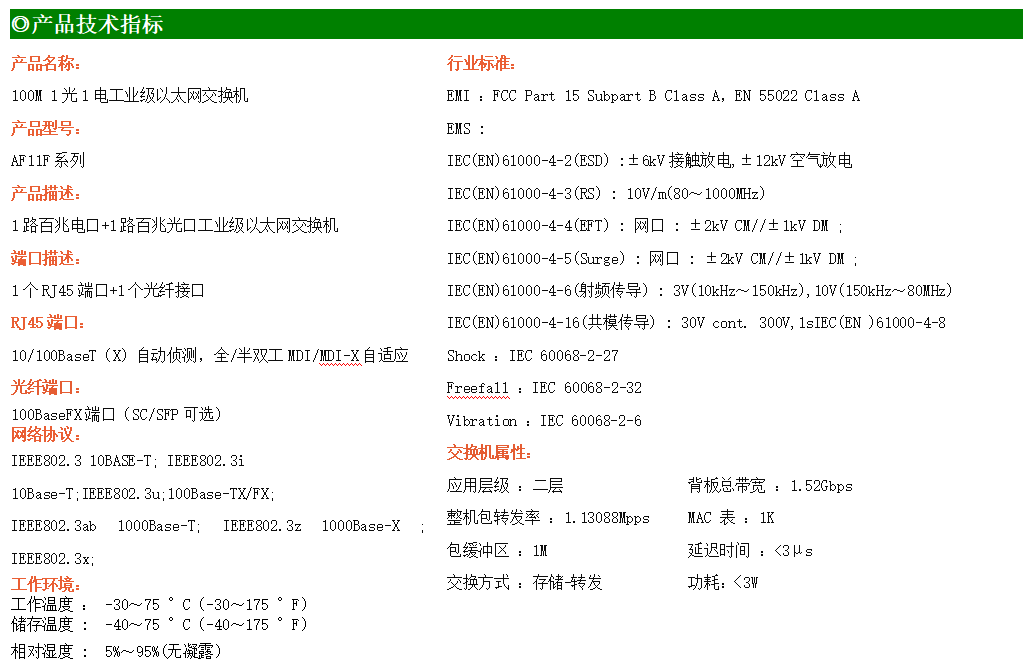 1路百兆電口+1路百兆SC光口工業級以太網交換機,支持1個10Base-T/100Base-TX電口和1個100Base-X光口。產品符合FCC、CE、ROHS標準。AF11F系列交換機具有-30℃~75℃的工作溫度,具有超強的堅固度能適應各種嚴苛環境,也可以非常方便的安置在空間緊湊的控制箱中。導軌的安裝特性、寬溫操作及擁有IP40防護等級的外殼及LED指示燈,使AF11F成為一個即插即用的工業級設備,為用戶的以太網設備聯網提供可靠、便捷的解決方案。