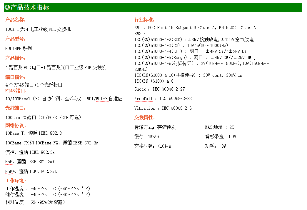 4路百兆POE電口+1路百兆SC光口工業(yè)級(jí)以太網(wǎng)POE交換機(jī),支持4個(gè)10/100Base-TX電口和1個(gè)100Base-X光口。產(chǎn)品符合FCC、CE、ROHS標(biāo)準(zhǔn)。RDL14FP系列交換機(jī)具有-40℃~75℃的工作溫度,具有超強(qiáng)的堅(jiān)固度能適應(yīng)各種嚴(yán)苛環(huán)境,也可以非常方便的安置在空間緊湊的控制箱中。導(dǎo)軌的安裝特性、寬溫操作及擁有IP40防護(hù)等級(jí)的外殼及LED指示燈,使RDL14FP成為一個(gè)即插即用的工業(yè)級(jí)設(shè)備,為用戶的以太網(wǎng)設(shè)備聯(lián)網(wǎng)提供可靠、便捷的解決方案。