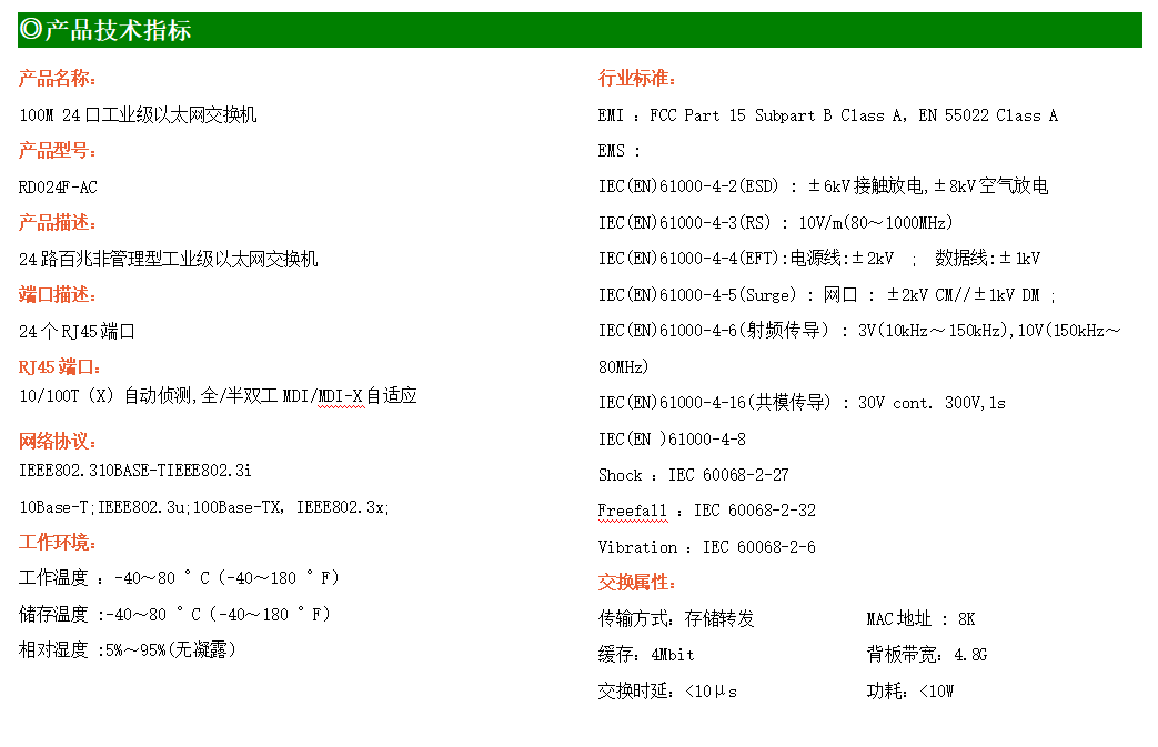 24路百兆電口工業(yè)級(jí)以太網(wǎng)交換機(jī),支持24個(gè)10Base-T/100Base-TX電口。產(chǎn)品符合FCC、CE、ROHS標(biāo)準(zhǔn)。RD024F交換機(jī)具有-40℃~80℃的工作溫度,具有超強(qiáng)的堅(jiān)固度能適應(yīng)各種嚴(yán)苛環(huán)境,也可以非常方便的安置在空間緊湊的控制箱中。機(jī)架式的安裝特性、寬溫操作及擁有IP40防護(hù)等級(jí)的外殼及LED指示燈,使RD024-AC成為一個(gè)即插即用的工業(yè)級(jí)設(shè)備,為用戶的以太網(wǎng)設(shè)備聯(lián)網(wǎng)提供可靠、便捷的解決方案。