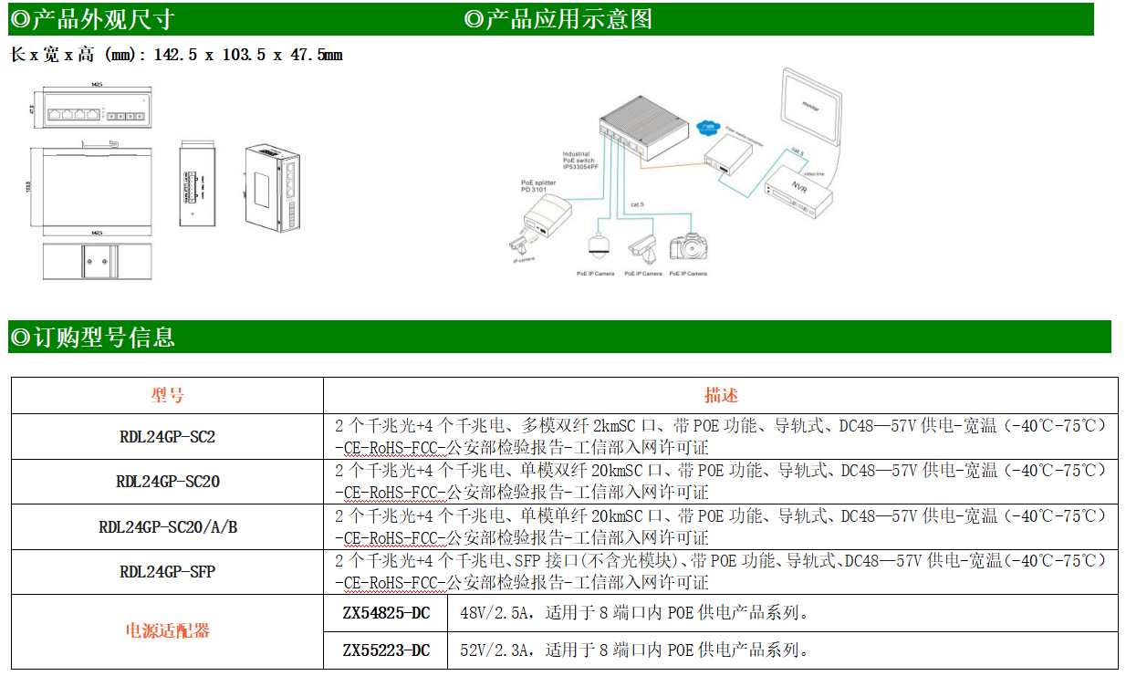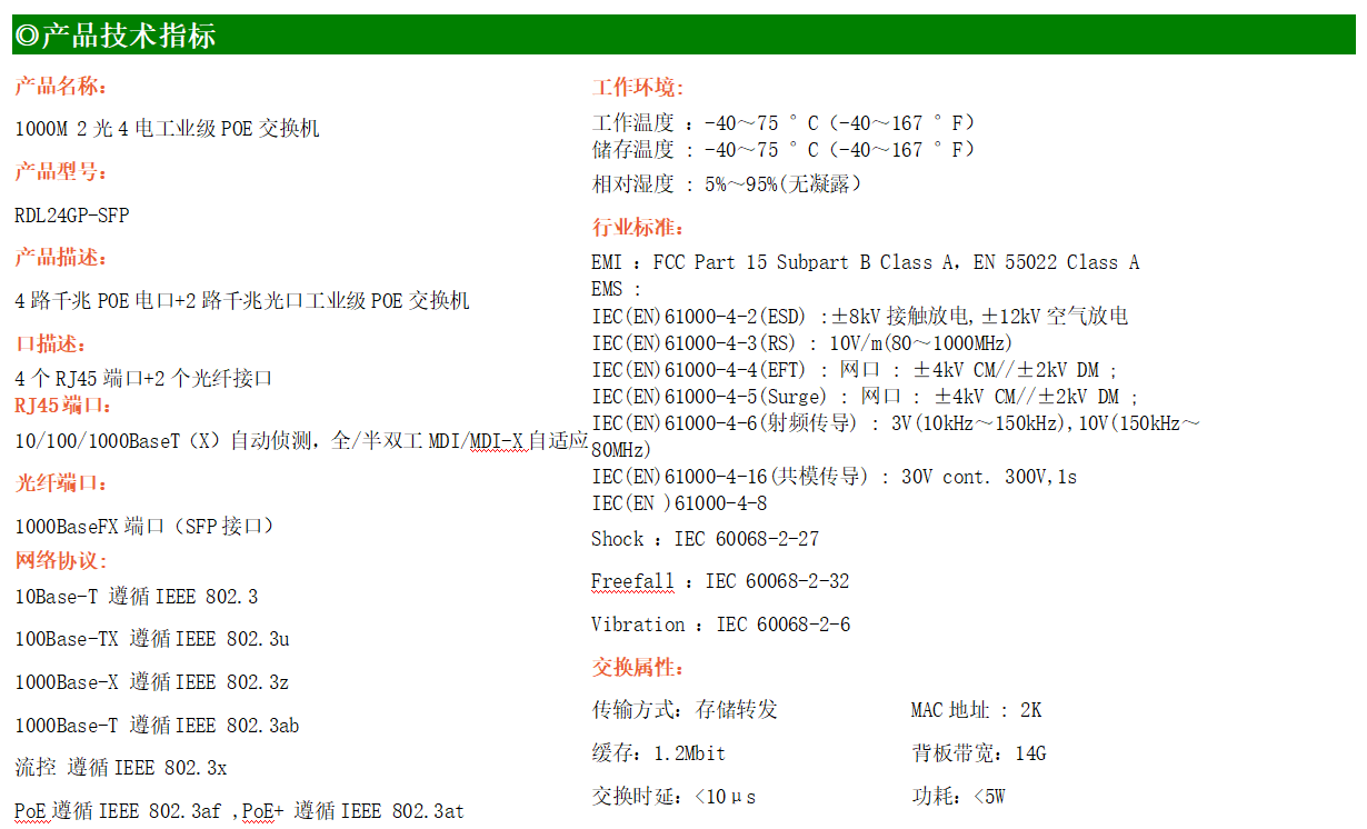 4路千兆POE電口+2路千兆FX光口工業級以太網POE交換機,支持4個10/100/1000Base-TX電口和2個1000Base-X光口。產品符合FCC、CE、ROHS標準。RDL24GP-SFP交換機具有-40℃~75℃的工作溫度,具有超強的堅固度能適應各種嚴苛環境,也可以非常方便的安置在空間緊湊的控制箱中。導軌的安裝特性、寬溫操作及擁有IP40防護等級的外殼及LED指示燈,使RDL24GP-SFP成為一個即插即用的工業級設備,為用戶的以太網設備聯網提供可靠、便捷的解決方案。
