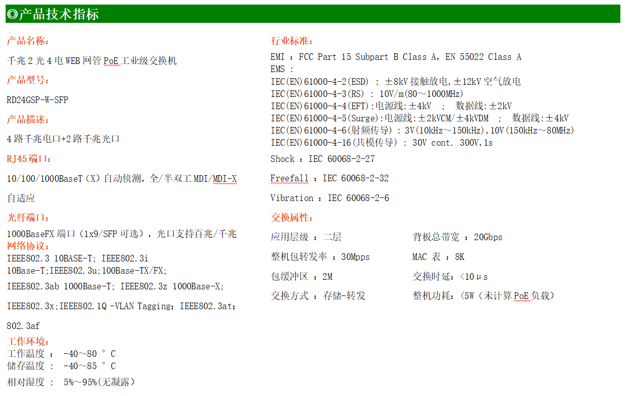 RD24GSP-W系列WEB管理工業級以太網PoE交換機,產品符合FCC、CE、ROHS標準,支持工業現場所需的以太網二層協議,保證通信網絡的穩定性。該系列交換機采用低功耗、無風扇設計,確保無噪聲干擾,同時支持-40~80℃工作溫度和良好的EMC電磁兼容性能,保證在惡劣的工業環境中保持穩定的工作,為工廠自動化,智能交通,視頻監控等工業應用領域組建快速穩定的網絡終端接入網絡提供安全可靠的解決方案。
