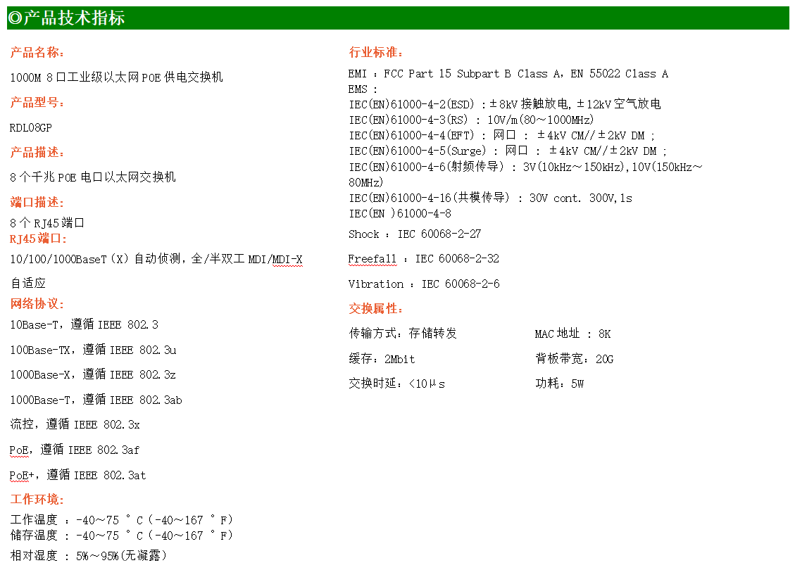 8路千兆電口工業(yè)級以太網(wǎng)交換機(jī),支持8個10Base-T/100Base-TX/1000Base-TX POE電口。產(chǎn)品符合FCC、CE、ROHS標(biāo)準(zhǔn)。RDL08GP交換機(jī)具有-40℃~75℃的工作溫度,具有超強(qiáng)的堅固度能適應(yīng)各種嚴(yán)苛環(huán)境,也可以非常方便的安置在空間緊湊的控制箱中。導(dǎo)軌的安裝特性、寬溫操作及擁有IP40防護(hù)等級的外殼及LED指示燈,使RDL08GP成為一個即插即用的工業(yè)級設(shè)備,為用戶的以太網(wǎng)設(shè)備聯(lián)網(wǎng)提供可靠、便捷的解決方案。