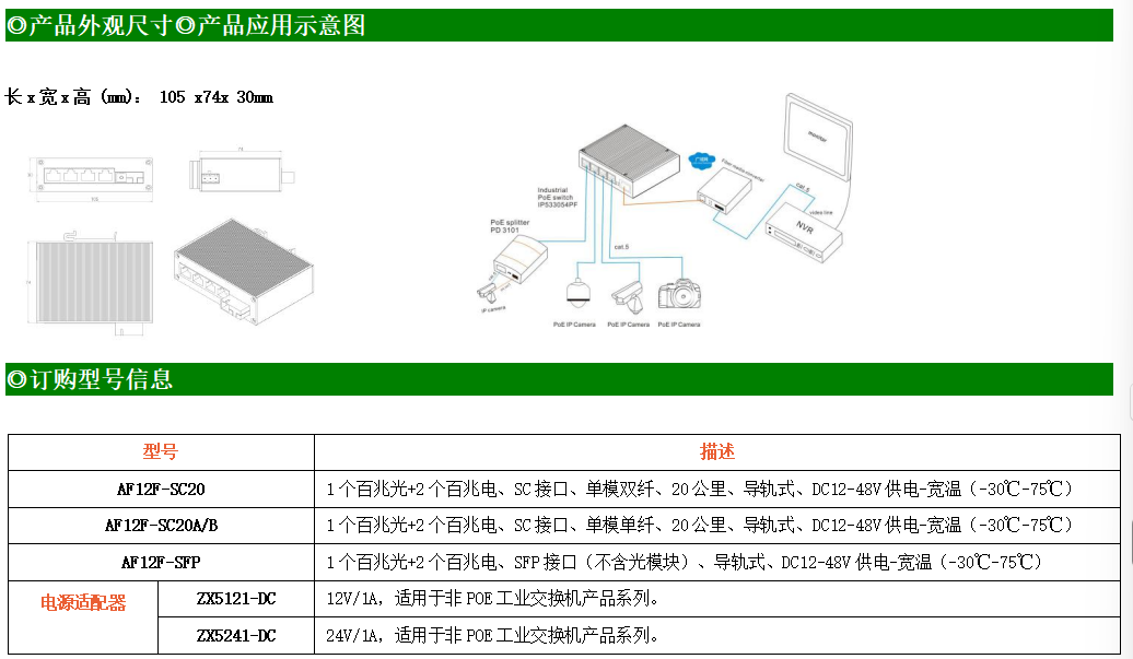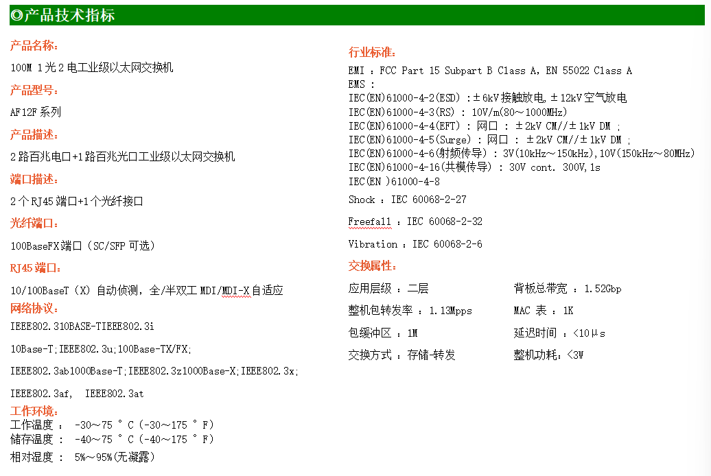 2路百兆電口+1路百兆SC光口工業級以太網交換機,支持2個10Base-T/100Base-TX電口和1個100Base-X光口。產品符合FCC、CE、ROHS標準。AF12F系列交換機具有-30℃~75℃的工作溫度,具有超強的堅固度能適應各種嚴苛環境,也可以非常方便的安置在空間緊湊的控制箱中。導軌的安裝特性、寬溫操作及擁有IP40防護等級的外殼及LED指示燈,使AF12F成為一個即插即用的工業級設備,為用戶的以太網設備聯網提供可靠、便捷的解決方案。