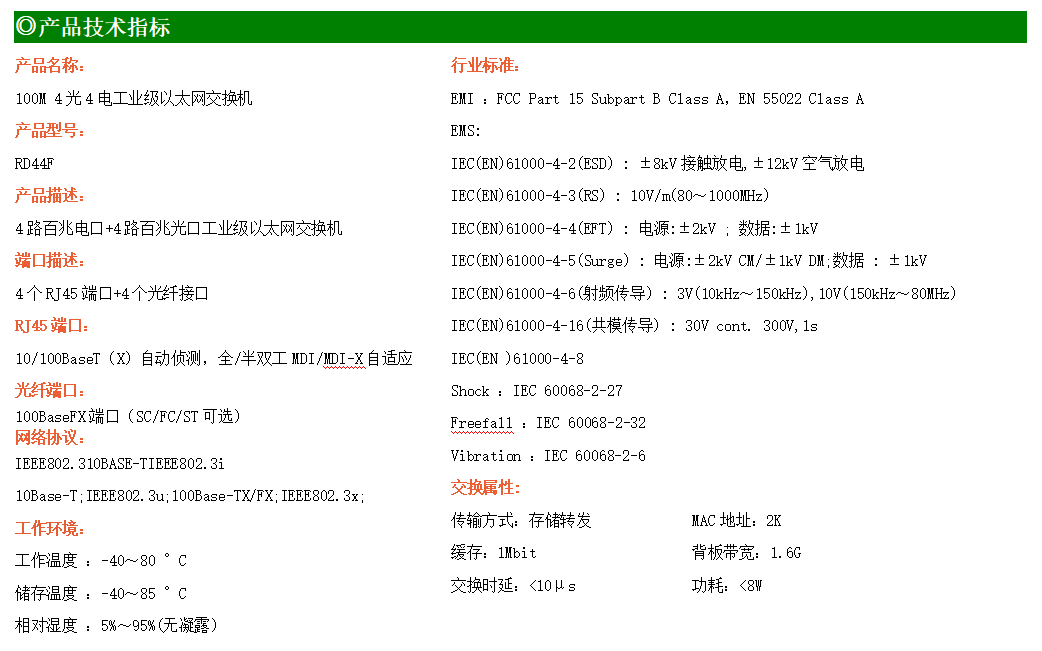 4路百兆電口+4路百兆光口工業級以太網交換機,支持4個10Base-T/100Base-TX電口和4個100Base-FX(SC/FC/ST可選)光口。產品符合FCC、CE、ROHS標準。RD44F交換機具有-40℃~80℃的工作溫度,具有超強的堅固度能適應各種嚴苛環境,也可以非常方便的安置在空間緊湊的控制箱中。導軌的安裝特性、寬溫操作及擁有IP40防護等級的外殼及LED指示燈,使RD44F成為一個即插即用的工業級設備,為用戶的以太網設備聯網提供可靠、便捷的解決方案。