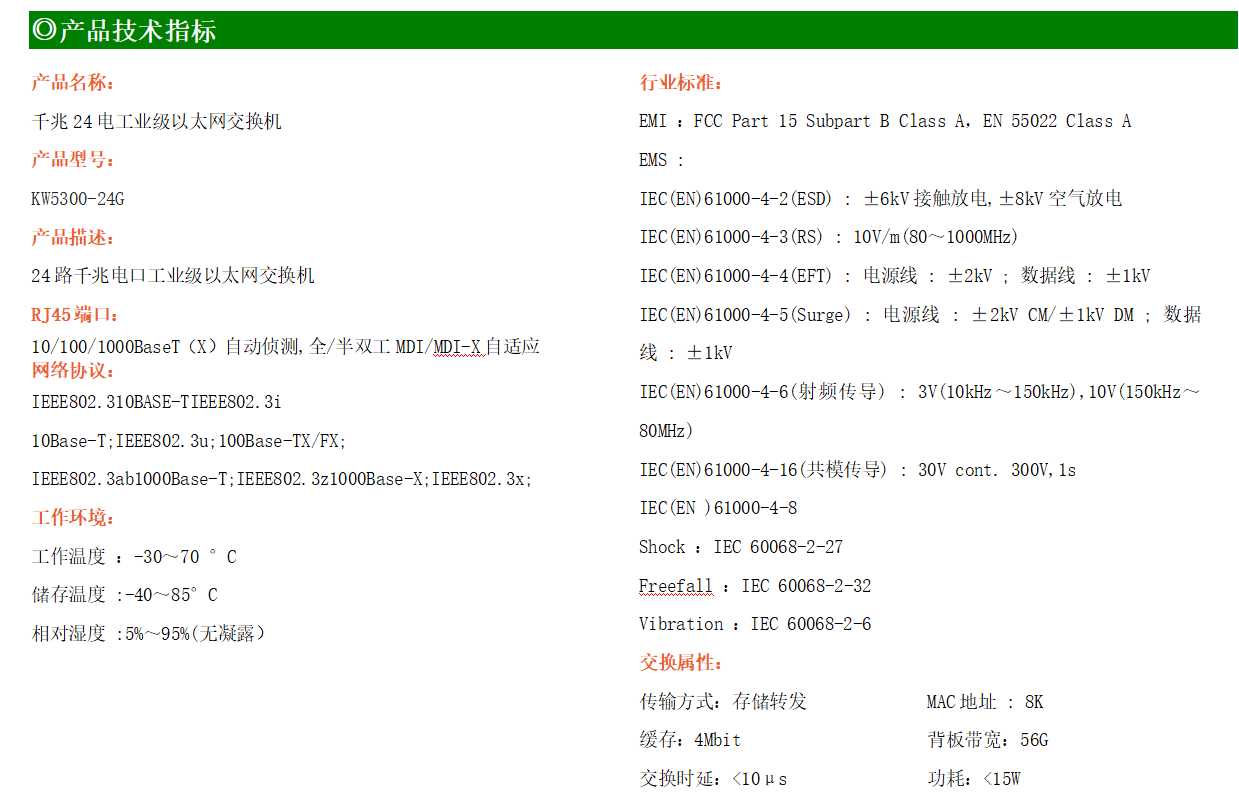 24路千兆電口工業(yè)級以太網(wǎng)交換機(jī),支持24個10Base-T/100Base-T/1000Base-TX電口。產(chǎn)品符合FCC、CE、ROHS標(biāo)準(zhǔn)。KW5300-24G交換機(jī)具有-30℃~70℃的工作溫度,具有超強(qiáng)的堅固度能適應(yīng)各種嚴(yán)苛環(huán)境,也可以非常方便的安置在空間緊湊的控制箱中。機(jī)架式安裝特性、寬溫操作及擁有IP40防護(hù)等級的外殼及LED指示燈,使KW5300-24G成為一個即插即用的工業(yè)級設(shè)備,為用戶的以太網(wǎng)設(shè)備聯(lián)網(wǎng)提供可靠、便捷的解決方案。