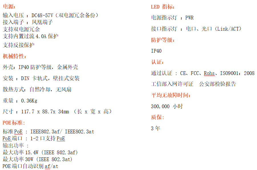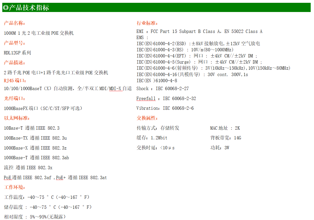 2路千兆POE電口+1路千兆FX光口工業(yè)級以太網(wǎng)POE交換機,支持2個10/100/1000Base-TX電口和1個1000Base-X光口。產(chǎn)品符合FCC、CE、ROHS標(biāo)準(zhǔn)。RDL12GP系列交換機具有-40℃~75℃的工作溫度,具有超強的堅固度能適應(yīng)各種嚴苛環(huán)境,也可以非常方便的安置在空間緊湊的控制箱中。導(dǎo)軌的安裝特性、寬溫操作及擁有IP40防護等級的外殼及LED指示燈,使RDL12GP成為一個即插即用的工業(yè)級設(shè)備,為用戶的以太網(wǎng)設(shè)備聯(lián)網(wǎng)提供可靠、便捷的解決方案。