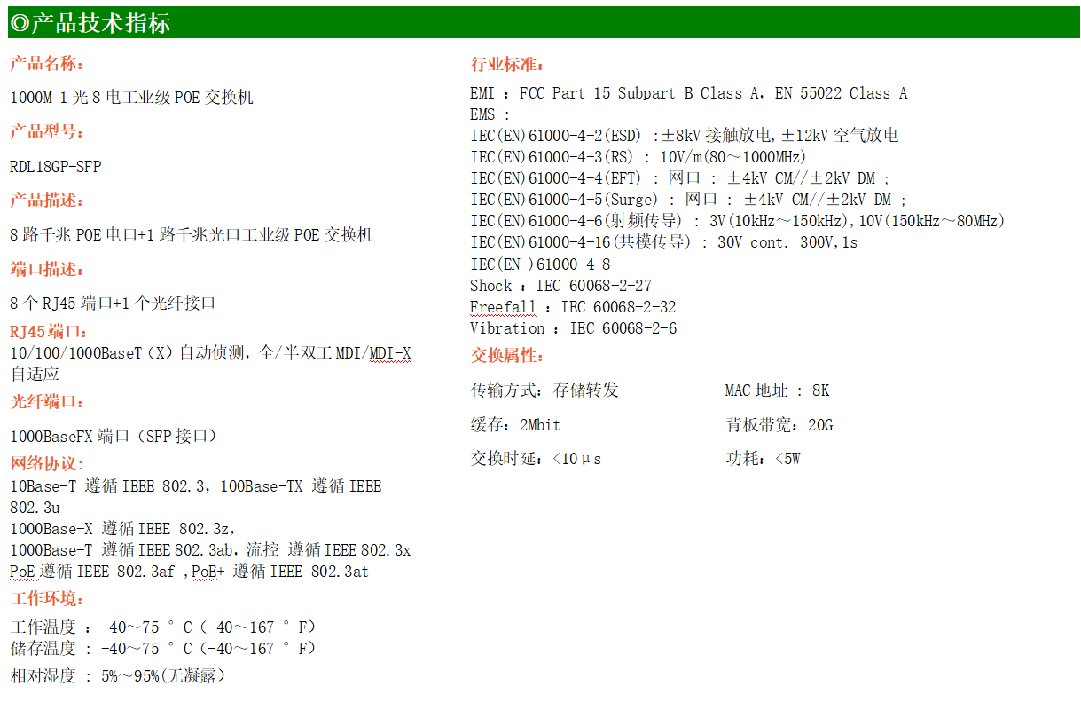 8路千兆POE電口+1路千兆FX光口工業(yè)級以太網(wǎng)POE交換機,支持8個10/100/1000Base-TX電口和1個1000Base-X光口。產(chǎn)品符合FCC、CE、ROHS標準。RDL18GP交換機具有-40℃~75℃的工作溫度,具有超強的堅固度能適應各種嚴苛環(huán)境,也可以非常方便的安置在空間緊湊的控制箱中。導軌的安裝特性、寬溫操作及擁有IP40防護等級的外殼及LED指示燈,使RDL18GP成為一個即插即用的工業(yè)級設備,為用戶的以太網(wǎng)設備聯(lián)網(wǎng)提供可靠、便捷的解決方案。