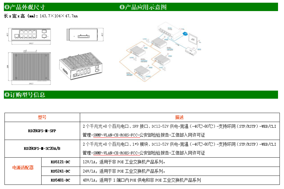RD28GFS-M-SFP是網(wǎng)管型工業(yè)以太網(wǎng)交換機(jī),產(chǎn)品符合FCC、CE、RoHS標(biāo)準(zhǔn)。支持2個千兆光口和8個百兆電口;支持工業(yè)現(xiàn)場所需的以太網(wǎng)二層協(xié)議,保證通信網(wǎng)絡(luò)的穩(wěn)定性;該系列交換機(jī)采用低功耗、無風(fēng)扇設(shè)計,確保無噪聲干擾,同時支持-40~80℃工作溫度和良好的EMC電磁兼容性能,保證在惡劣的工業(yè)環(huán)境中保持穩(wěn)定的工作,為工廠自動化,智能交通,視頻監(jiān)控等工業(yè)應(yīng)用領(lǐng)域組建快速穩(wěn)定的網(wǎng)絡(luò)終端接入網(wǎng)絡(luò)提供安全可靠的解決方案。