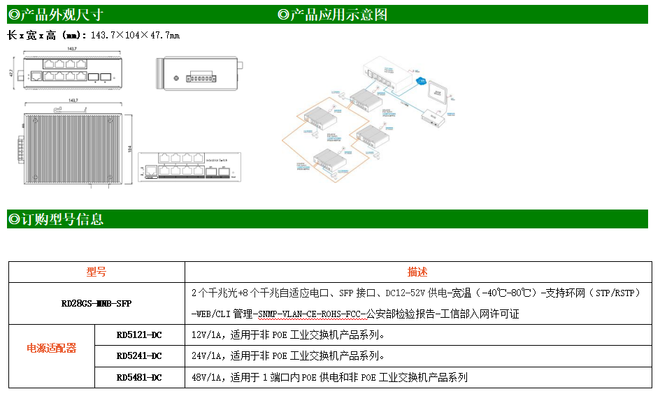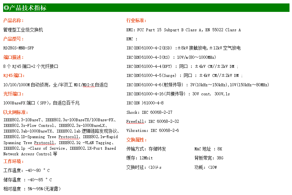 RD28GS-MNB是網(wǎng)管型工業(yè)以太網(wǎng)交換機(jī),產(chǎn)品符合FCC、CE、RoHS標(biāo)準(zhǔn)。支持2個(gè)千兆光口和8個(gè)千兆電口;支持工業(yè)現(xiàn)場(chǎng)所需的以太網(wǎng)二層協(xié)議,保證通信網(wǎng)絡(luò)的穩(wěn)定性;該系列交換機(jī)采用低功耗、無風(fēng)扇設(shè)計(jì),確保無噪聲干擾,同時(shí)支持-40~85℃工作溫度和良好的EMC電磁兼容性能,保證在惡劣的工業(yè)環(huán)境中保持穩(wěn)定的工作,為工廠自動(dòng)化,智能交通,視頻監(jiān)控等工業(yè)應(yīng)用領(lǐng)域組建快速穩(wěn)定的網(wǎng)絡(luò)終端接入網(wǎng)絡(luò)提供安全可靠的解決方案。