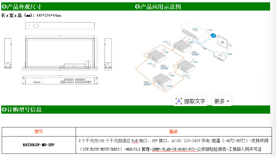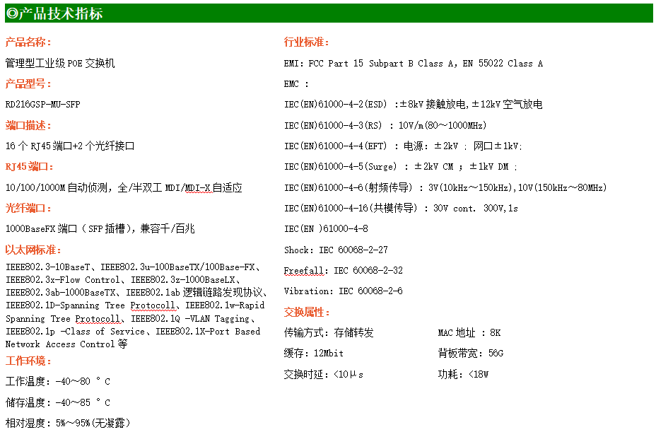 RD216GSP-MU-SFP是網(wǎng)管型工業(yè)以太網(wǎng)POE交換機,產(chǎn)品符合FCC、CE、RoHS標準。支持2個千兆光口和16個千兆POE電口,所有PoE端口符合IEEE802.3af/at標準。支持工業(yè)現(xiàn)場所需的以太網(wǎng)二層協(xié)議,保證通信網(wǎng)絡的穩(wěn)定性;該系列交換機采用低功耗、無風扇設計,確保無噪聲干擾,同時支持-40~80℃工作溫度和良好的EMC電磁兼容性能,保證在惡劣的工業(yè)環(huán)境中保持穩(wěn)定的工作,為工廠自動化,智能交通,視頻監(jiān)控等工業(yè)應用領域組建快速穩(wěn)定的網(wǎng)絡終端接入網(wǎng)絡提供安全可靠的解決方案。