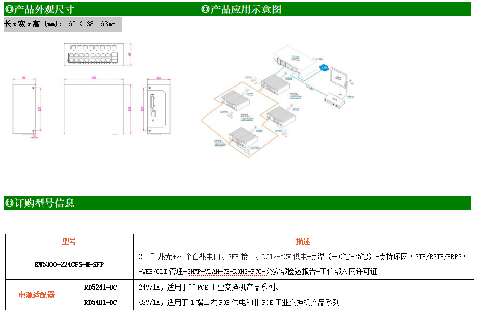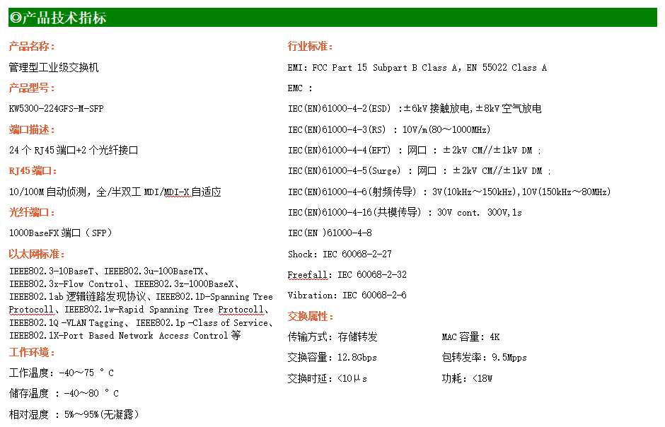 KW5300-224GFS-M是網(wǎng)管型工業(yè)以太網(wǎng)交換機(jī),產(chǎn)品符合FCC、CE、RoHS標(biāo)準(zhǔn)。支持2個(gè)千兆光口和24個(gè)百兆電口;支持工業(yè)現(xiàn)場所需的以太網(wǎng)二層協(xié)議,保證通信網(wǎng)絡(luò)的穩(wěn)定性;該系列交換機(jī)采用低功耗、無風(fēng)扇設(shè)計(jì),確保無噪聲干擾,同時(shí)支持-40~75℃工作溫度和良好的EMC電磁兼容性能,保證在惡劣的工業(yè)環(huán)境中保持穩(wěn)定的工作,為工廠自動(dòng)化,智能交通,視頻監(jiān)控等工業(yè)應(yīng)用領(lǐng)域組建快速穩(wěn)定的網(wǎng)絡(luò)終端接入網(wǎng)絡(luò)提供安全可靠的解決方案。