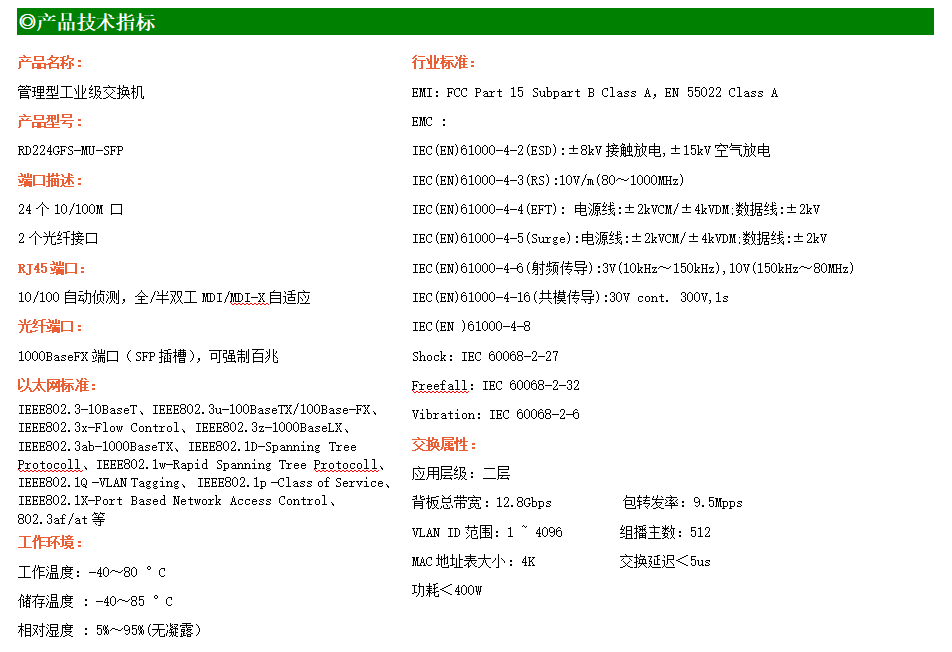 RD224GFSP-MU-AC-SFP是網管型工業以太網PoE交換機,產品符合FCC、CE、RoHS標準??商峁?4個百兆PoE端口,所有PoE端口符合IEEE802.3af/at標準。支持工業現場所需的以太網二層協議,保證通信網絡的穩定性;該系列交換機采用低功耗、無風扇設計,確保無噪聲干擾,同時支持-40~85℃工作溫度和良好的EMC電磁兼容性能,保證在惡劣的工業環境中保持穩定的工作,為工廠自動化,智能交通,視頻監控等工業應用領域組建快速穩定的網絡終端接入網絡提供安全可靠的解決方案。
