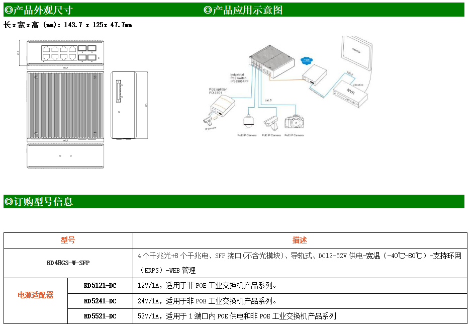 RD48GS-W-SFP系列WEB網(wǎng)管工業(yè)級以太網(wǎng)交換機,產(chǎn)品符合FCC、CE、ROHS標準,支持工業(yè)現(xiàn)場所需的以太網(wǎng)二層協(xié)議,保證通信網(wǎng)絡的穩(wěn)定性。該系列交換機采用低功耗、無風扇設計,確保無噪聲干擾,同時支持-40~80℃工作溫度和良好的EMC電磁兼容性能,保證在惡劣的工業(yè)環(huán)境中保持穩(wěn)定的工作,為工廠自動化,智能交通,視頻監(jiān)控等工業(yè)應用領域組建快速穩(wěn)定的網(wǎng)絡終端接入網(wǎng)絡提供安全可靠的解決方案。