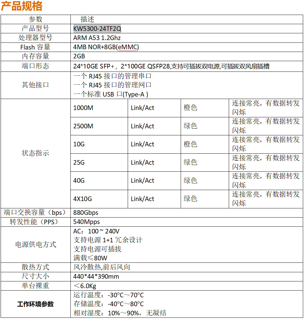 KW5300-24TF2Q是一款高性能萬兆核心交換機產(chǎn)品,可廣泛應(yīng)用于運營商大型IP 城域網(wǎng)匯聚層或中小型城域網(wǎng)核心層、園區(qū)網(wǎng)企業(yè)網(wǎng)核心。整機設(shè)備提供大容量、高密度、模塊化的二/三層線速轉(zhuǎn)發(fā)性能,豐富的業(yè)務(wù)功能、強大的QoS 保障和完善的安全管理機制,具有電信級的可靠性設(shè)計,可以提供電源部件的冗余,保證網(wǎng)絡(luò)核心的穩(wěn)定和關(guān)鍵業(yè)務(wù)的可靠運行;具有880G的交換容量,支持所有端口線速轉(zhuǎn)發(fā)。產(chǎn)品具有彈性堆疊功能,將多臺設(shè)備虛擬化成一臺邏輯實體,既能滿足端口和交換容量的擴容,又能實現(xiàn)多臺設(shè)備統(tǒng)一管理、升級、維護等需求。針對于數(shù)據(jù)中心數(shù)據(jù)流量大和無阻塞傳輸?shù)囊螅a(chǎn)品可以提供強大的緩存能力,并且支持先進的緩存調(diào)度機制可以保證設(shè)備緩存能力最大化的有效利用。旨在滿足下一代企業(yè)網(wǎng)、數(shù)據(jù)中心和城域網(wǎng)對于高密度高帶寬的網(wǎng)絡(luò)應(yīng)用需求。可應(yīng)用于網(wǎng)絡(luò)運營商或園區(qū)以太網(wǎng)匯聚層或接入層,也可作為數(shù)據(jù)中心接入層、中小企業(yè)核心層,并為數(shù)據(jù)中心提供豐富的服務(wù)器接入方案。