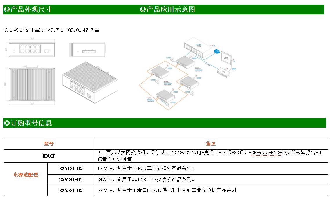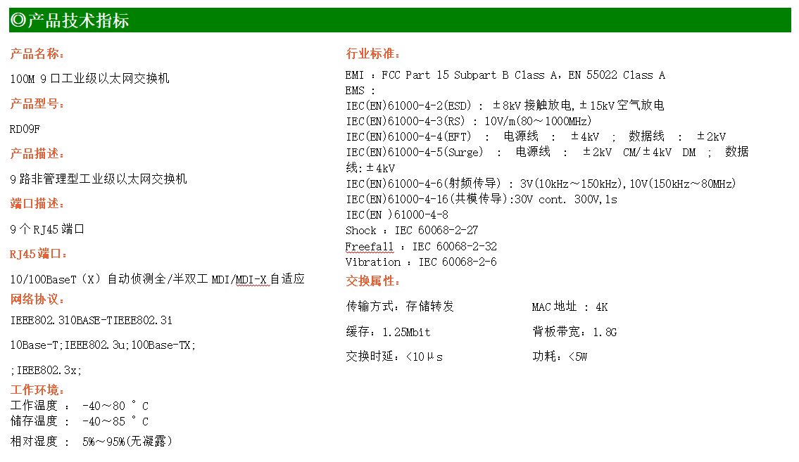 9路百兆電口工業級以太網交換機,支持9個10Base-T/100Base-TX電口。產品符合FCC、CE、ROHS標準。RD09F交換機具有-40℃~80℃的工作溫度,具有超強的堅固度能適應各種嚴苛環境,也可以非常方便的安置在空間緊湊的控制箱中。導軌的安裝特性、寬溫操作及擁有IP40防護等級的外殼及LED指示燈,使RD09F成為一個即插即用的工業級設備,為用戶的以太網設備聯網提供可靠、便捷的解決方案。