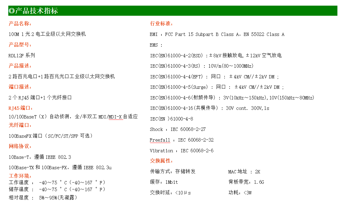 2路百兆電口+1路百兆FX光口工業(yè)級(jí)以太網(wǎng)交換機(jī),支持2個(gè)10Base-T/100Base-TX電口和1個(gè)100Base-X光口。產(chǎn)品符合FCC、CE、ROHS標(biāo)準(zhǔn)。RDL12F系列交換機(jī)具有-40℃~75℃的工作溫度,具有超強(qiáng)的堅(jiān)固度能適應(yīng)各種嚴(yán)苛環(huán)境,也可以非常方便的安置在空間緊湊的控制箱中。導(dǎo)軌的安裝特性、寬溫操作及擁有IP40防護(hù)等級(jí)的外殼及LED指示燈,使RDL12F成為一個(gè)即插即用的工業(yè)級(jí)設(shè)備,為用戶的以太網(wǎng)設(shè)備聯(lián)網(wǎng)提供可靠、便捷的解決方案。
