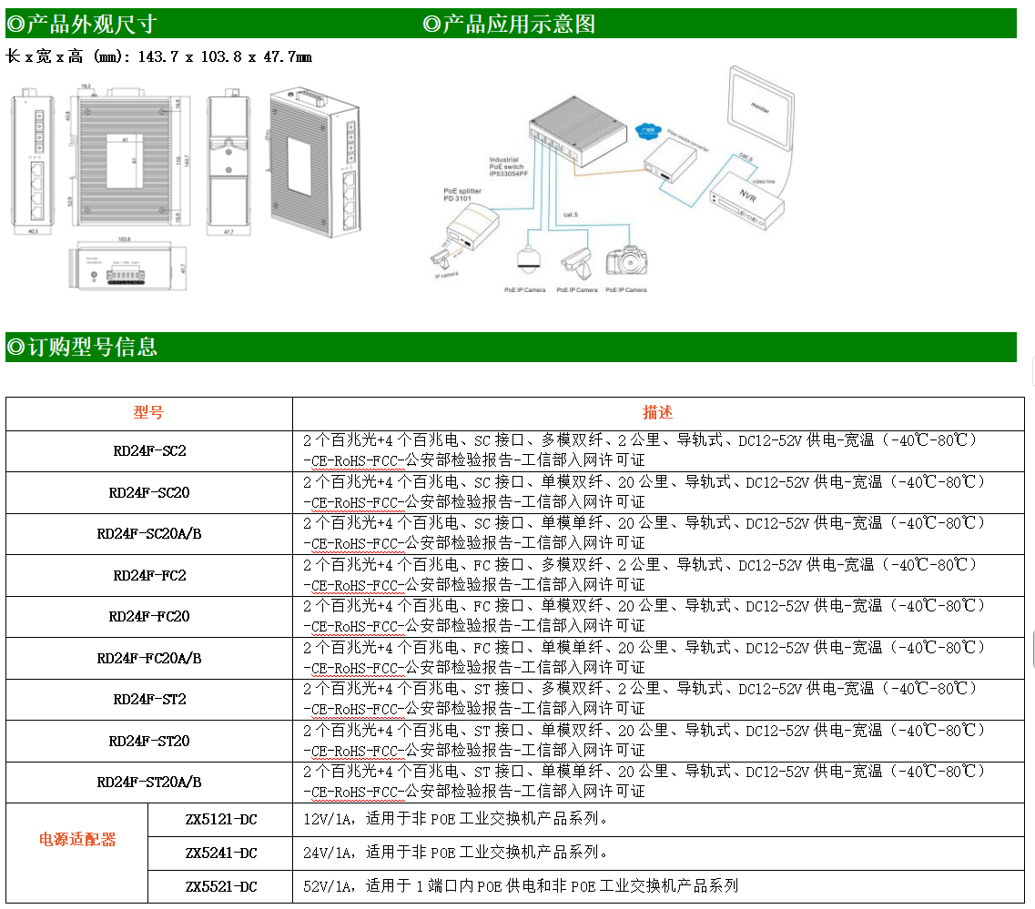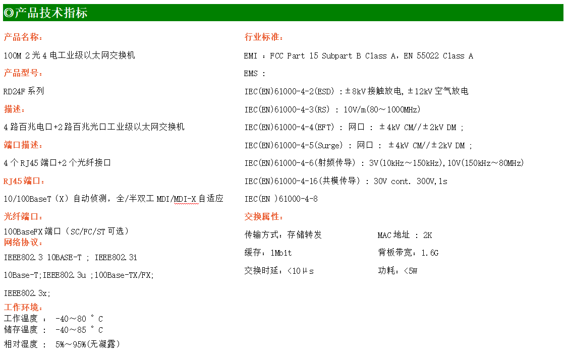 4路百兆電口+2路百兆FX光口工業級以太網交換機,支持4個10Base-T/100Base-TX電口和2個100Base-X光口。產品符合FCC、CE、ROHS標準。RD24F系列交換機具有-40℃~80℃的工作溫度,具有超強的堅固度能適應各種嚴苛環境,也可以非常方便的安置在空間緊湊的控制箱中。導軌的安裝特性、寬溫操作及擁有IP40防護等級的外殼及LED指示燈,使RD24F成為一個即插即用的工業級設備,為用戶的以太網設備聯網提供可靠、便捷的解決方案。