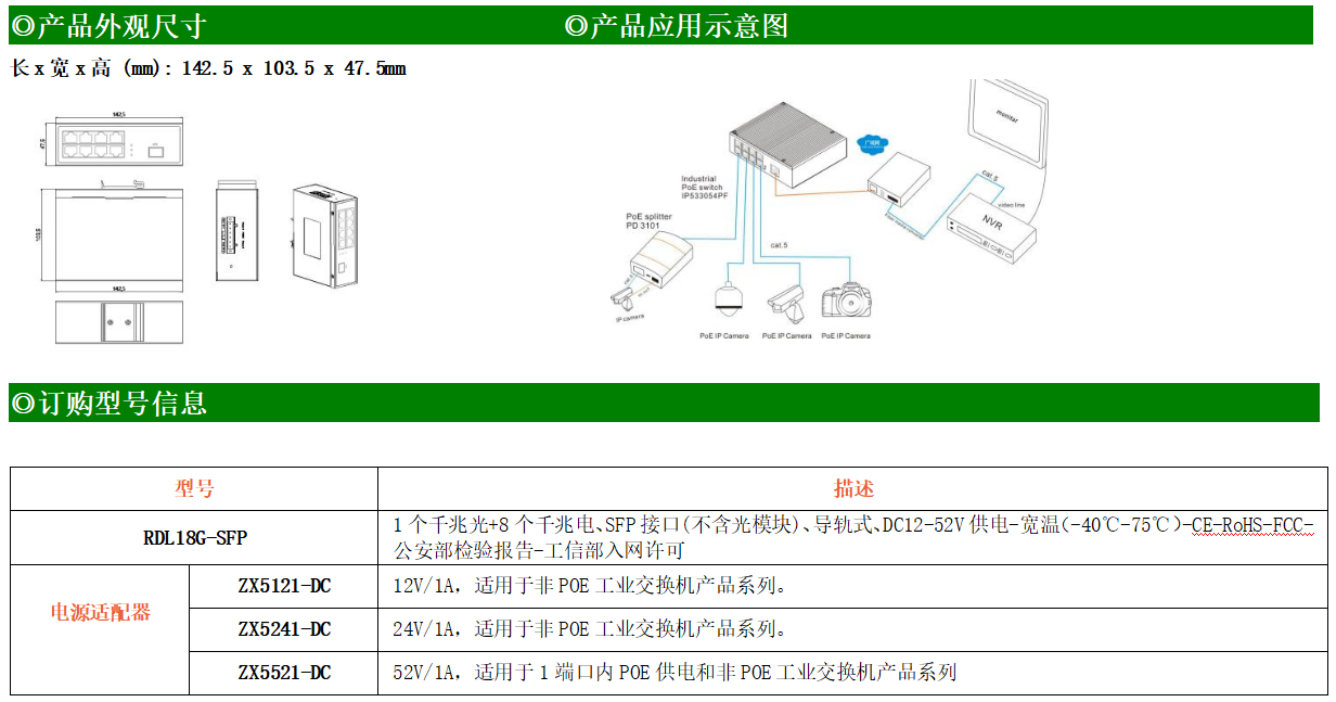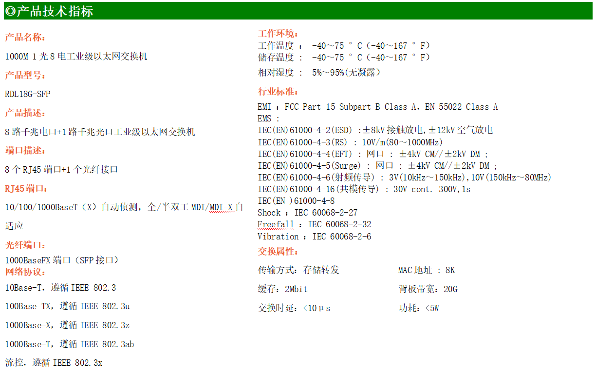 8路千兆電口+1路千兆FX光口工業(yè)級以太網交換機,支持8個100Base-T/1000Base-TX電口和1個1000Base-X光口。產品符合FCC、CE、ROHS標準。RDL18G系列交換機具有-40℃~75℃的工作溫度,具有超強的堅固度能適應各種嚴苛環(huán)境,也可以非常方便的安置在空間緊湊的控制箱中。導軌的安裝特性、寬溫操作及擁有IP40防護等級的外殼及LED指示燈,使RDL18G系列成為一個即插即用的工業(yè)級設備,為用戶的以太網設備聯網提供可靠、便捷的解決方案。