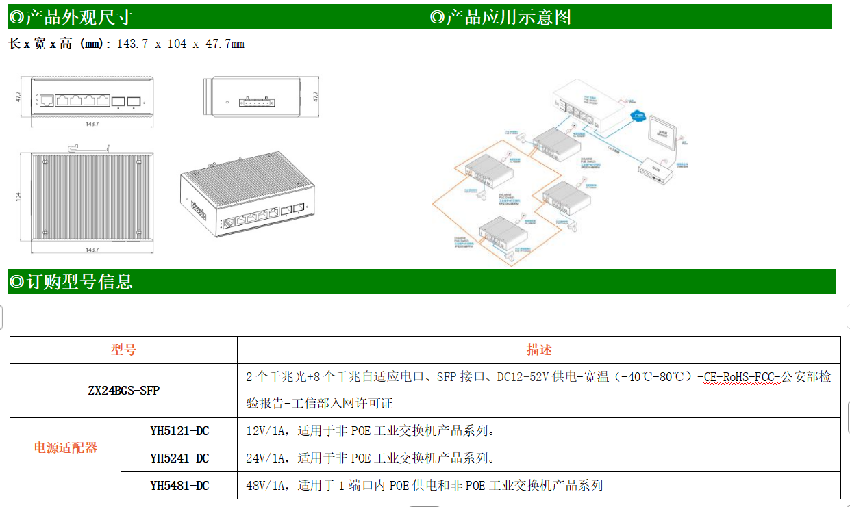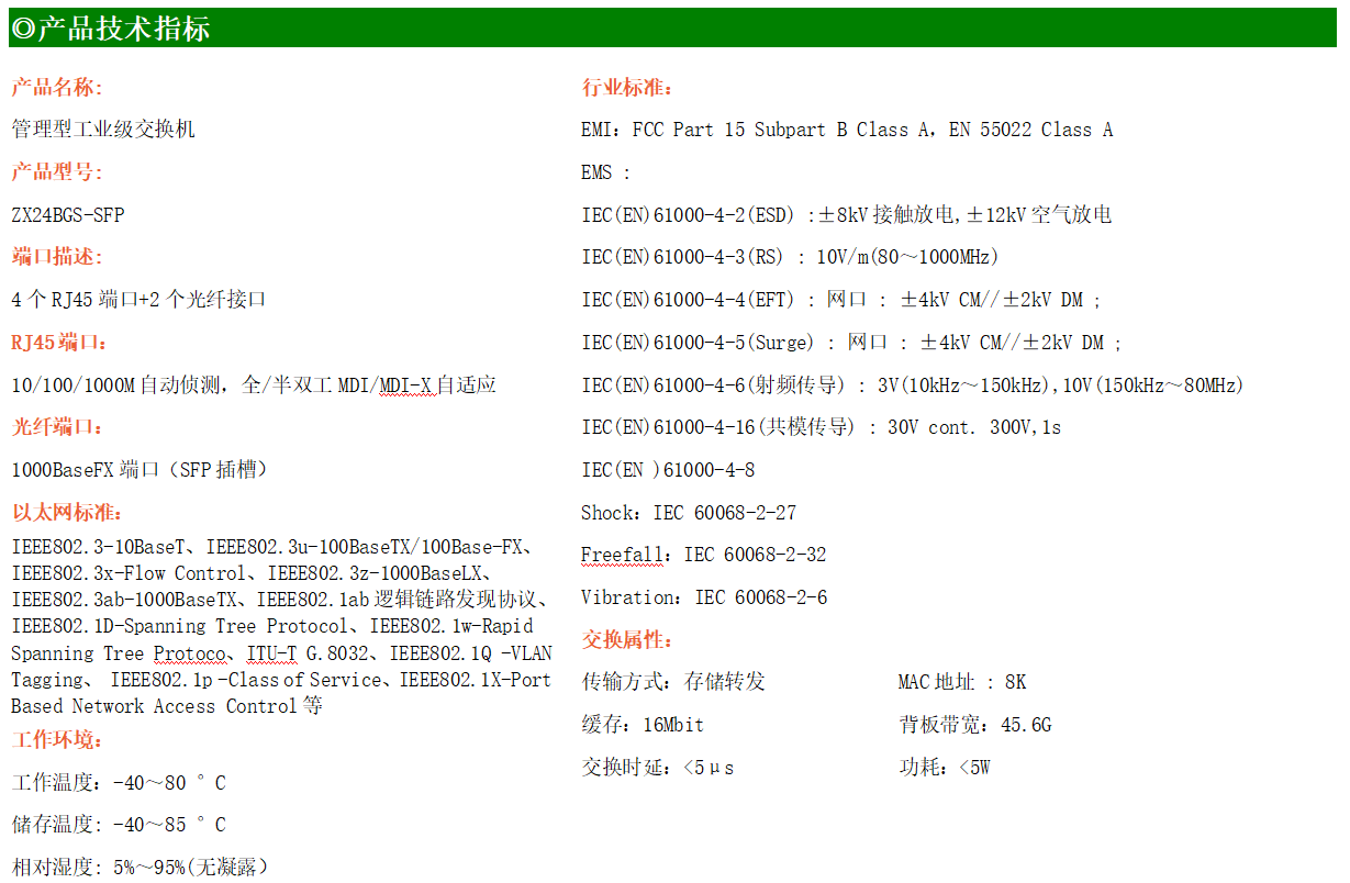 ZX24BGS-SFP是網管型工業(yè)以太網交換機,產品符合FCC、CE、ROHS標準。支持2個千兆光口和4個千兆電口,支持一路console口;支持工業(yè)現(xiàn)場所需的以太網二層協(xié)議,保證通信網絡的穩(wěn)定性;該系列交換機采用低功耗、無風扇設計,確保無噪聲干擾,同時支持-40~85℃工作溫度和良好的EMC電磁兼容性能,保證在惡劣的工業(yè)環(huán)境中保持穩(wěn)定的工作,為工廠自動化,智能交通,視頻監(jiān)控等工業(yè)應用領域組建快速穩(wěn)定的網絡終端接入網絡提供安全可靠的解決方案。