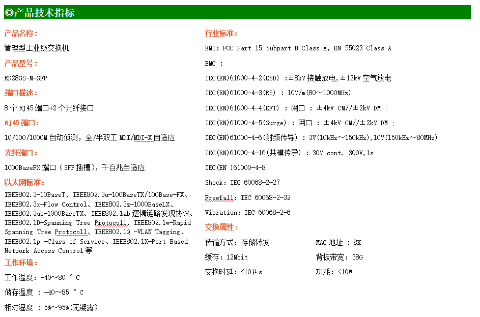 RD28GS-M是網管型工業以太網交換機,產品符合FCC、CE、RoHS標準。支持2個千兆光口和8個千兆電口;支持工業現場所需的以太網二層協議,保證通信網絡的穩定性;該系列交換機采用低功耗、無風扇設計,確保無噪聲干擾,同時支持-40~80℃工作溫度和良好的EMC電磁兼容性能,保證在惡劣的工業環境中保持穩定的工作,為工廠自動化,智能交通,視頻監控等工業應用領域組建快速穩定的網絡終端接入網絡提供安全可靠的解決方案。
