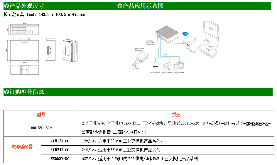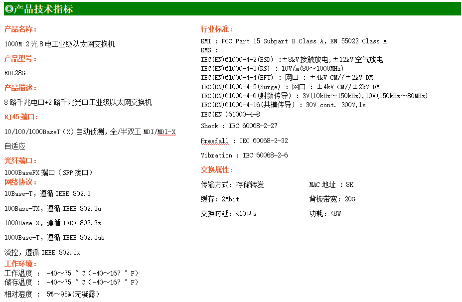 8路千兆電口+2路千兆FX光口工業級以太網交換機,支持8個100Base-T/1000Base-TX電口和2個1000Base-X光口。產品符合FCC、CE、ROHS標準。RDL28G交換機具有-40℃~75℃的工作溫度,具有超強的堅固度能適應各種嚴苛環境,也可以非常方便的安置在空間緊湊的控制箱中。導軌的安裝特性、寬溫操作及擁有IP40防護等級的外殼及LED指示燈,使RDL28G成為一個即插即用的工業級設備,為用戶的以太網設備聯網提供可靠、便捷的解決方案。
