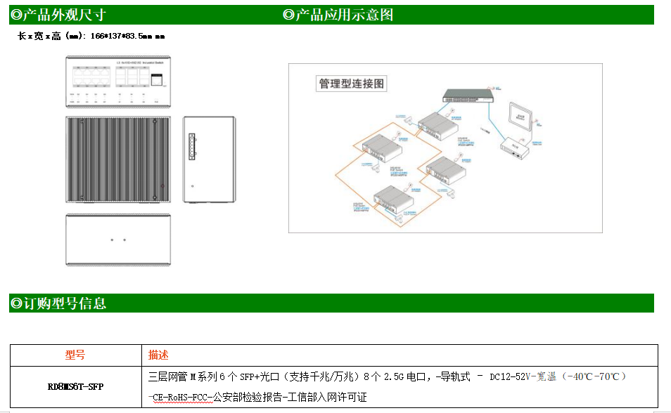 RD8MS6T-SFP交換機(jī)是我司推出的一款萬兆三層工業(yè)以太網(wǎng)交換機(jī),產(chǎn)品符合FCC、CE、RoHS標(biāo)準(zhǔn)??商峁?個(gè)2.5G 端口。具備先進(jìn)的硬件處理能力和最豐富的業(yè)務(wù)特性。支持IPv4/IPv6 硬件雙棧及線速轉(zhuǎn)發(fā),使客戶能夠從容應(yīng)對(duì)即將帶來的IPv6 時(shí)代其提供高容量的交換能力。RD8MS6T-SFP交換機(jī)具有-40℃~70℃的工作溫度,具有超強(qiáng)的堅(jiān)固度能適應(yīng)各種嚴(yán)苛環(huán)境。導(dǎo)軌式安裝特性、寬溫操作,使RD8MS6T-SFP的交換機(jī)成為一個(gè)即插即用的工業(yè)級(jí)設(shè)備,為用戶的以太網(wǎng)設(shè)備聯(lián)網(wǎng)提供可靠、便捷的解決方案。