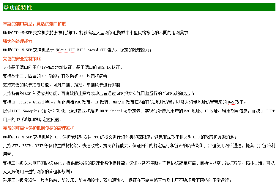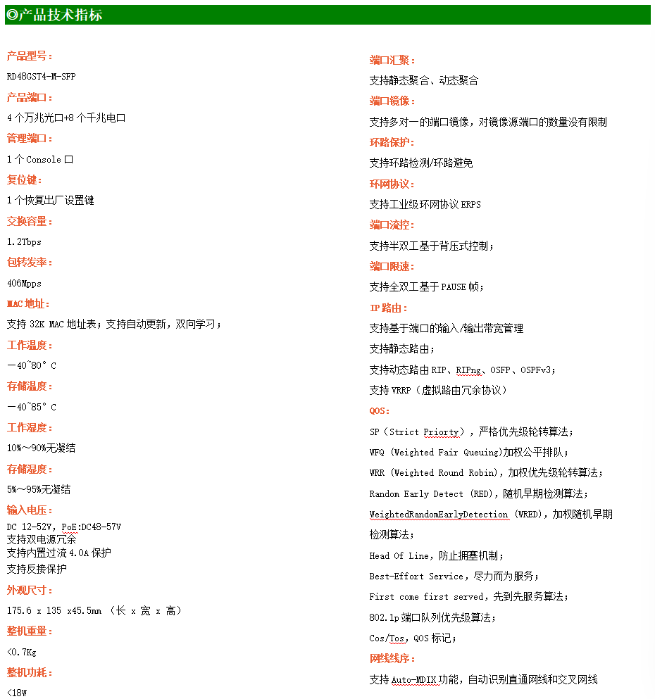 ●網(wǎng)絡冗余:支持STP/RSTP/MSTP,支持ERPS(自愈時間<20ms)