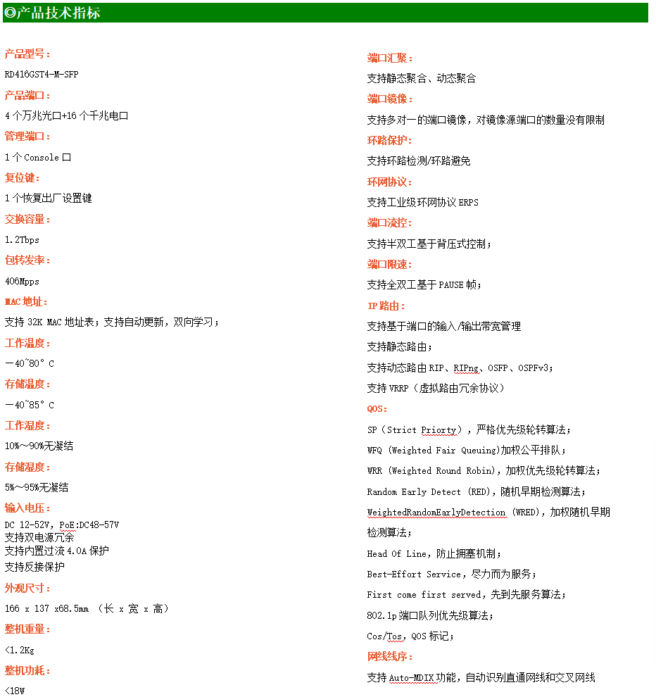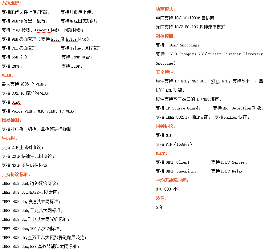 ●網(wǎng)絡(luò)冗余:支持STP/RSTP/MSTP,支持ERPS(自愈時間<20ms)