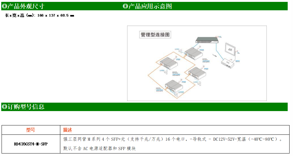 RD416GST4-M-SFP交換機(jī)是我司推出的一款萬兆三層交換機(jī),配備4個萬兆SFP+光口和16個10/100/1000M Base-T自適應(yīng)電口,具備先進(jìn)的硬件處理能力和最豐富的業(yè)務(wù)特性。支持IPv4/IPv6 硬件雙棧及線速轉(zhuǎn)發(fā),使客戶能夠從容應(yīng)對即將帶來的IPv6 時代其提供高容量的交換能力。RD416GST4-M-SFP交換機(jī)具有-40℃~80℃的工作溫度,具有超強(qiáng)的堅固度能適應(yīng)各種嚴(yán)苛環(huán)境。導(dǎo)軌式安裝特性、寬溫操作,使RD416GST4-M-SFP的交換機(jī)成為一個即插即用的工業(yè)級設(shè)備,為用戶的以太網(wǎng)設(shè)備聯(lián)網(wǎng)提供可靠、便捷的解決方案。