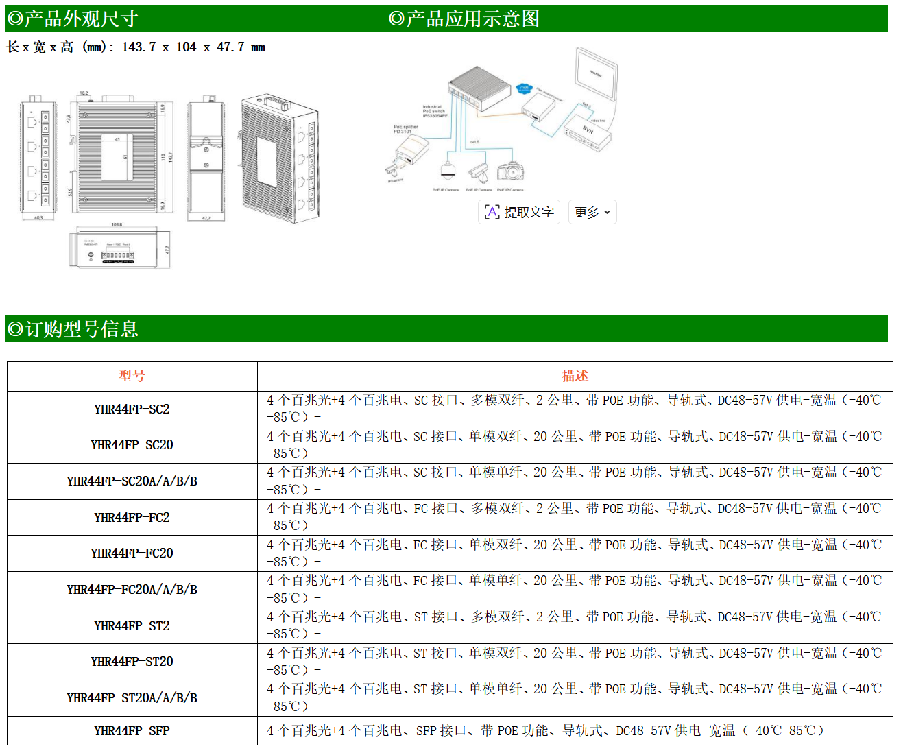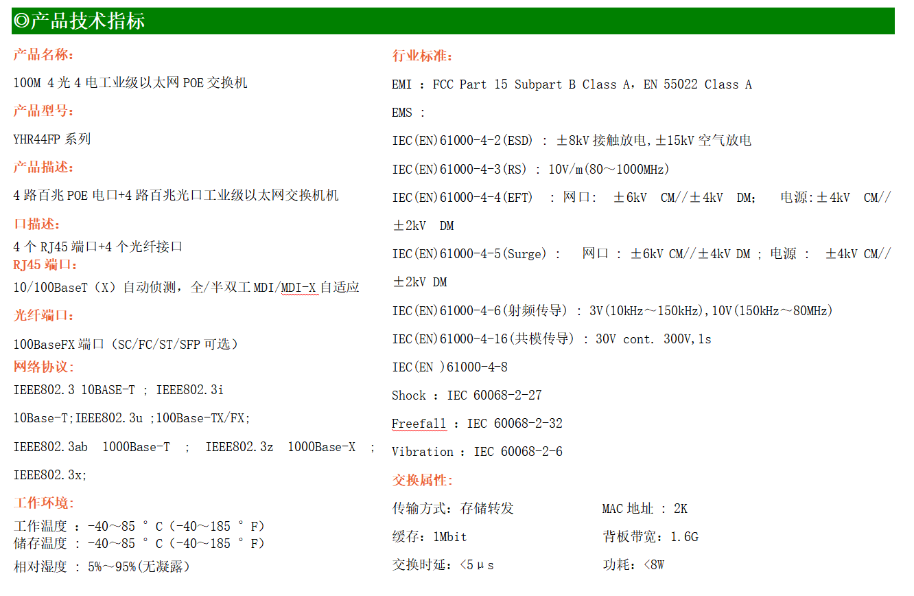 4路百兆POE電口+4路百兆FX光口工業(yè)級以太網(wǎng)交換機(jī),支持4個10Base-T/100Base-TX電口和4個100Base-X光口。產(chǎn)品符合FCC、CE、ROHS標(biāo)準(zhǔn)。YH200-44FP系列交換機(jī)具有-40℃~85℃的工作溫度,具有超強(qiáng)的堅(jiān)固度能適應(yīng)各種嚴(yán)苛環(huán)境,也可以非常方便的安置在空間緊湊的控制箱中。導(dǎo)軌的安裝特性、寬溫操作及擁有IP40防護(hù)等級的外殼及LED指示燈,使YH200-44FP成為一個即插即用的工業(yè)級設(shè)備,為用戶的以太網(wǎng)設(shè)備聯(lián)網(wǎng)提供可靠、便捷的解決方案。
