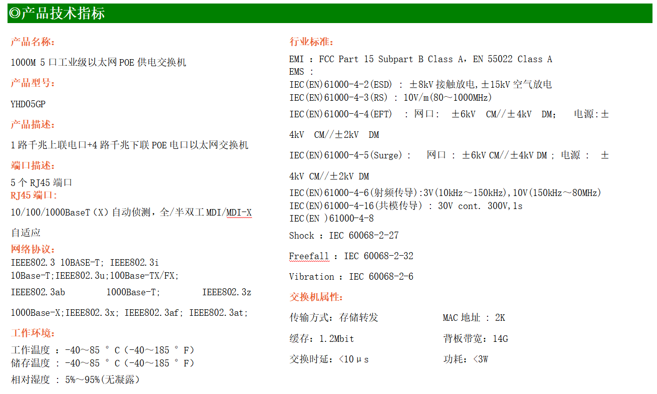 1路千兆上聯電口+4路千兆下聯電口工業級以太網POE交換機,支持1個10/100/1000Base-TX上聯電口和4個100Base-T/1000Base-TX下聯POE電口。產品符合FCC、CE、ROHS標準。YH300-05GP交換機具有-40℃~85℃的工作溫度,具有超強的堅固度能適應各種嚴苛環境,也可以非常方便的安置在空間緊湊的控制箱中。導軌的安裝特性、寬溫操作及擁有IP40防護等級的外殼及LED指示燈,使YH300-05GP成為一個即插即用的工業級設備,為用戶的以太網設備聯網提供可靠、便捷的解決方案。