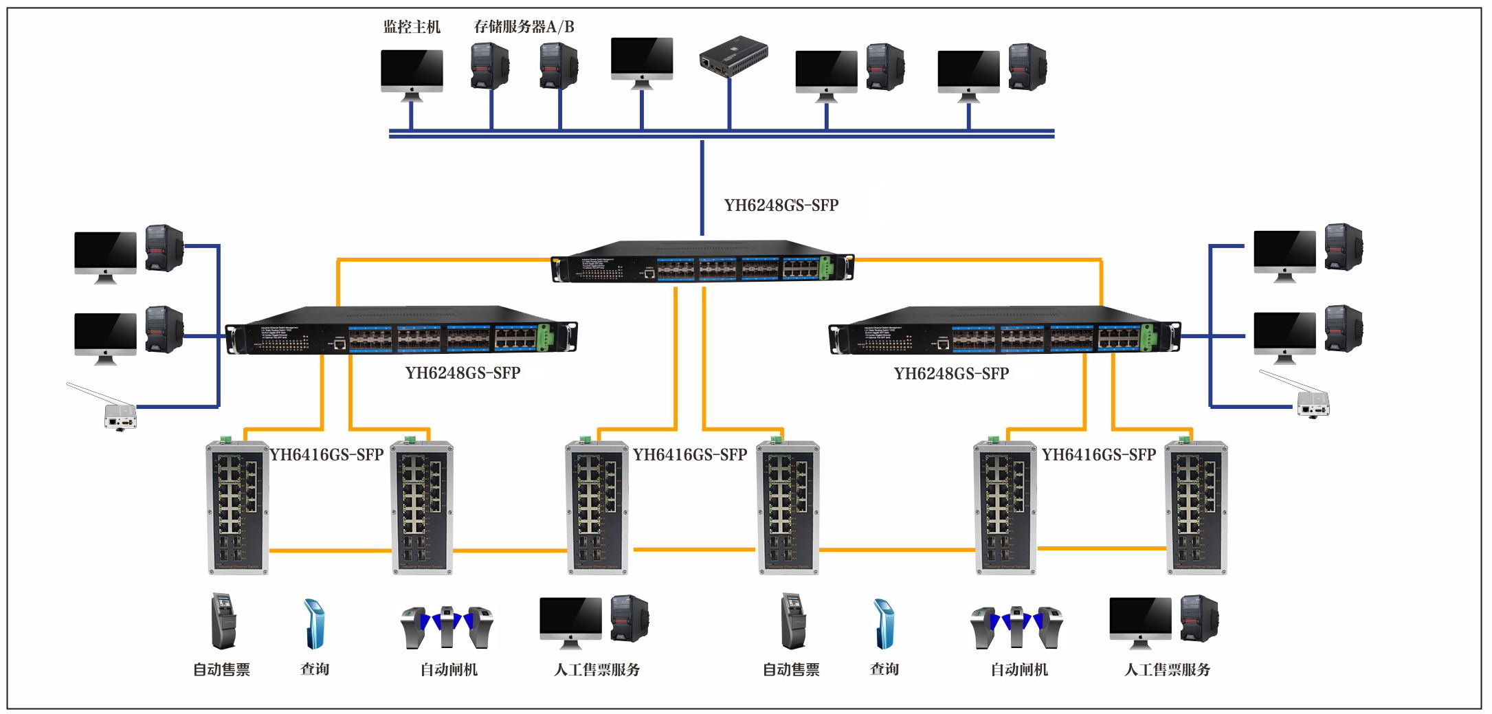 宇航在軌道交通自動(dòng)售票檢票系統(tǒng)解決方案中采用了YH6248G4TS-SFP,YH6416GS-SFP工業(yè)交換機(jī)設(shè)備組網(wǎng)。車(chē)站終端系統(tǒng):車(chē)站終端系統(tǒng)設(shè)備與YH6416GS-SFP系列網(wǎng)管型工業(yè)以太網(wǎng)交換機(jī)分別相連,再與核心交換機(jī)組成冗余環(huán)網(wǎng)。